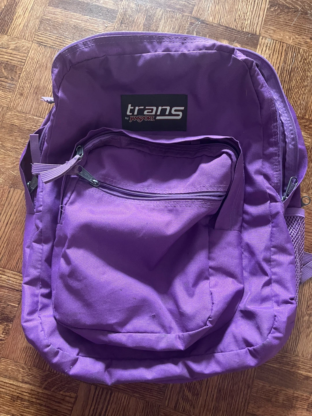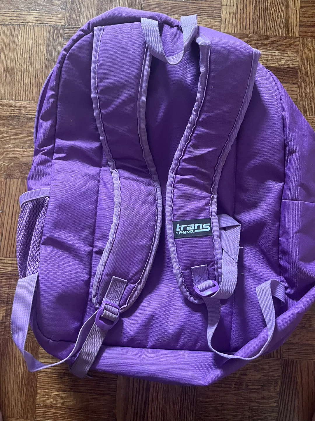 Selling a Jansport Trans backpack in purple! It's a great backpack for school, work, or travel. It has a spacious main compartment and a front pocket for easy access to your essentials. The backpack is in good condition and ready for a new adventure