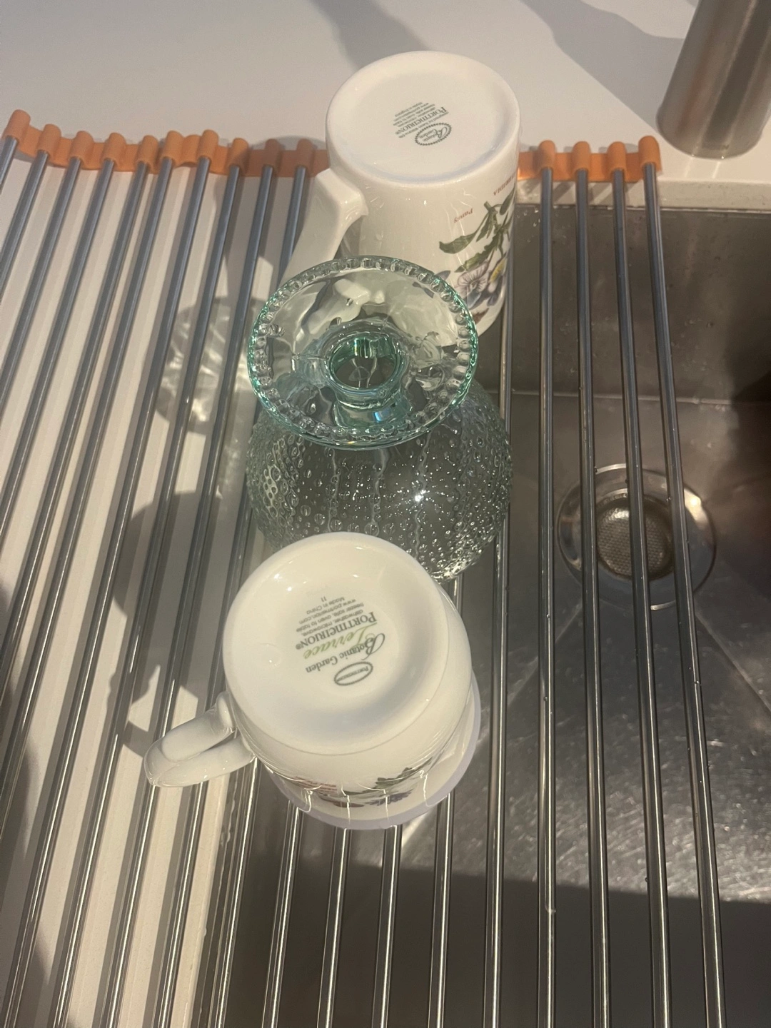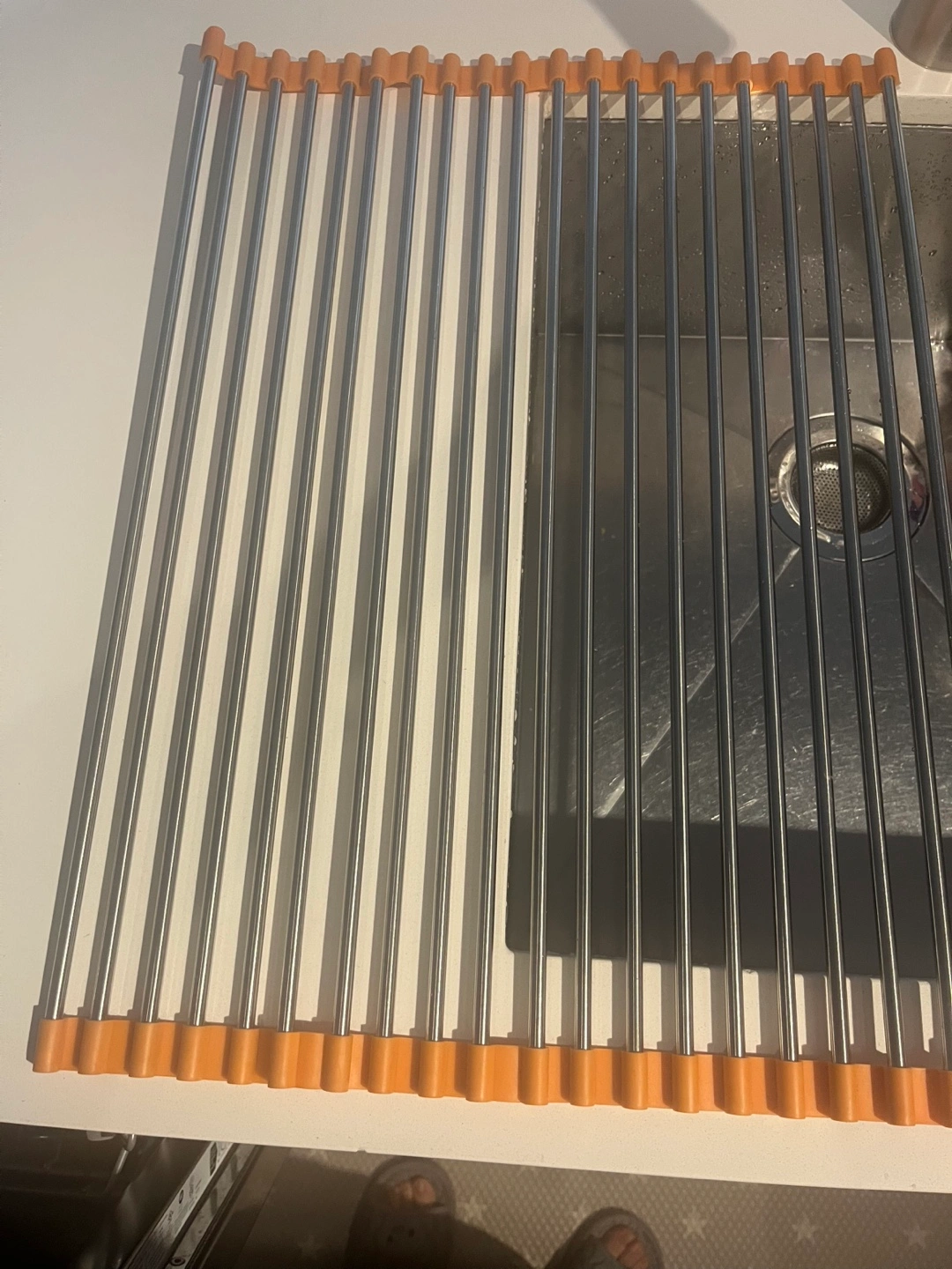 Roll-up dish drying rack. Durable stainless steel construction. Orange plastic end caps. Compact storage.