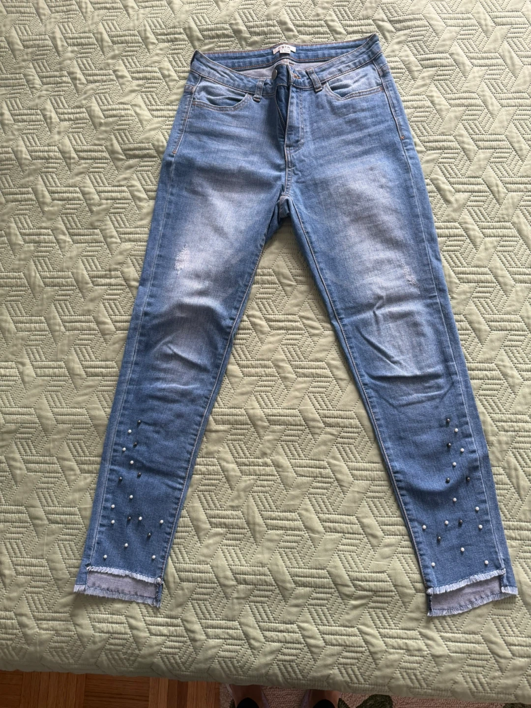 These O'stin jeans are a size EU 27. They're a light wash denim with pearl and stud embellishments on the ankle cuffs.