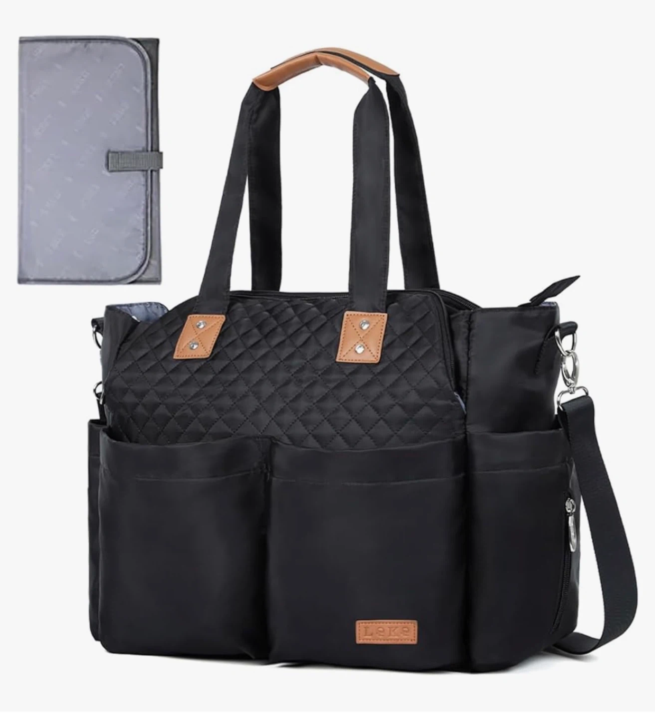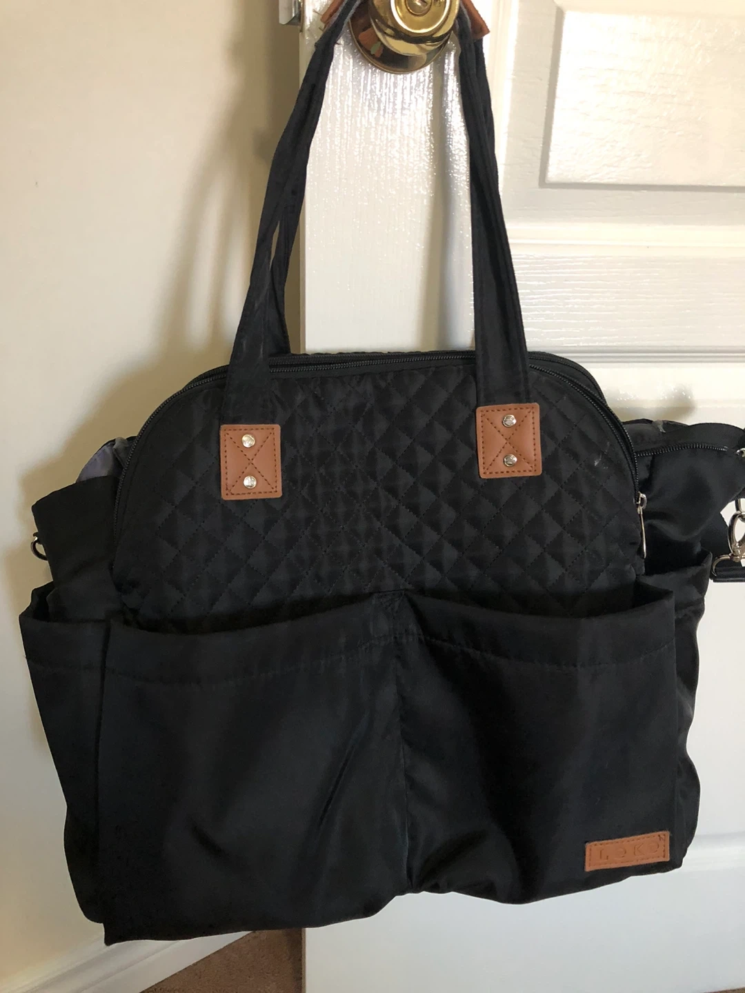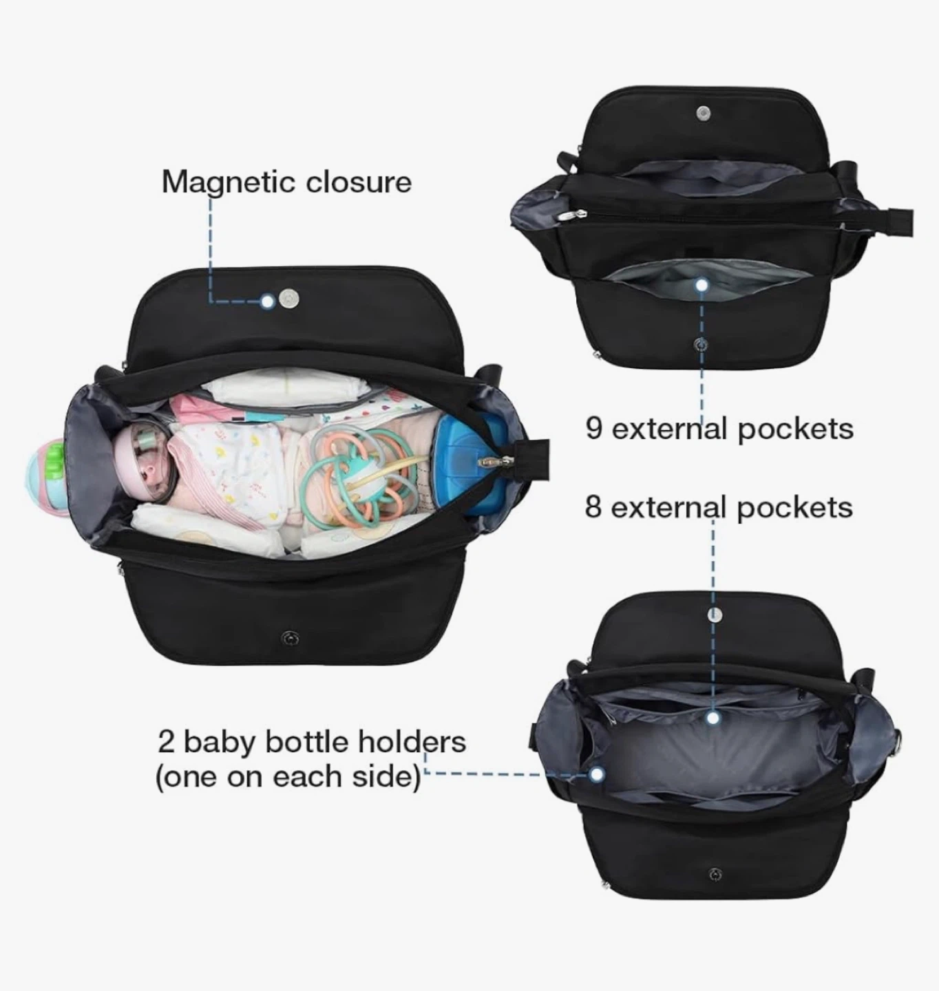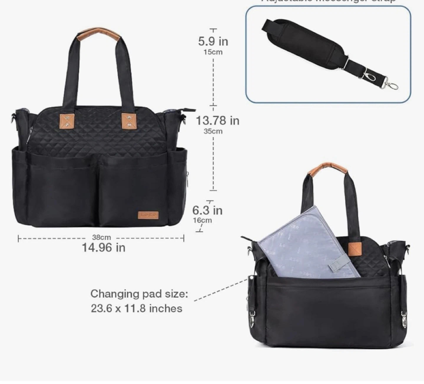 This black quilted diaper bag has a magnetic closure and 17 pockets, including 2 insulated bottle holders. It comes with an adjustable messenger strap and a matching changing pad. Dimensions: 14.96" W x 6.3" D x 13.78" H.