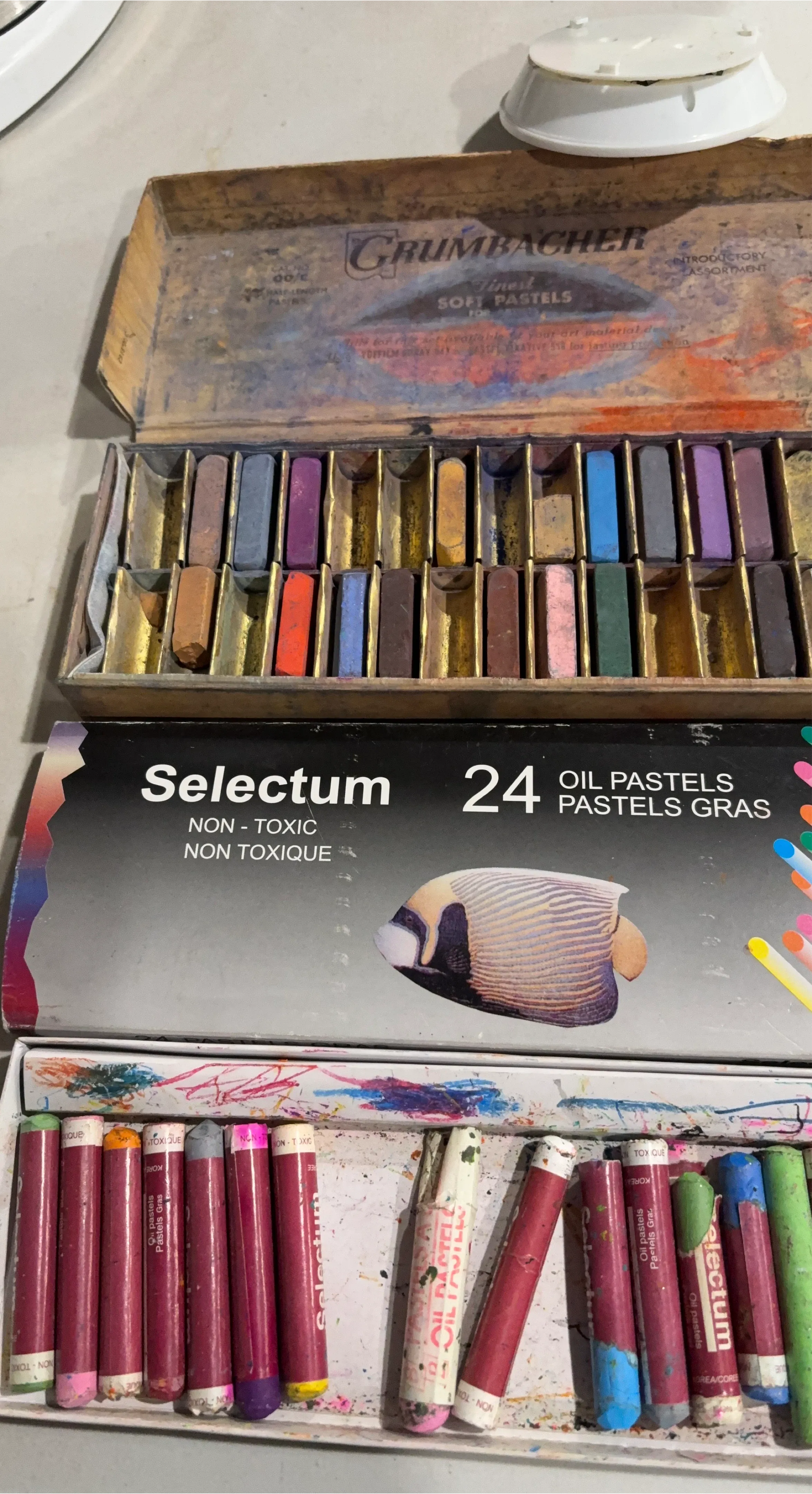 This lot includes a vintage Grumbacher soft pastels introductory assortment and a Selectum 24-piece oil pastels set. The Grumbacher set is in its original wooden box and contains a variety of colours. The Selectum set is also complete with 24 oil pastels. Both sets are non-toxic.