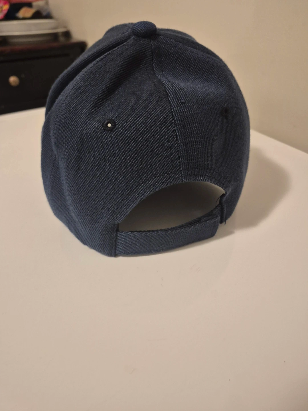 This navy blue baseball cap features a stylish white anchor embroidered on the front. It's made from a durable fabric with an adjustable strap for a comfortable fit. It's great for casual wear or a day out in the sun!