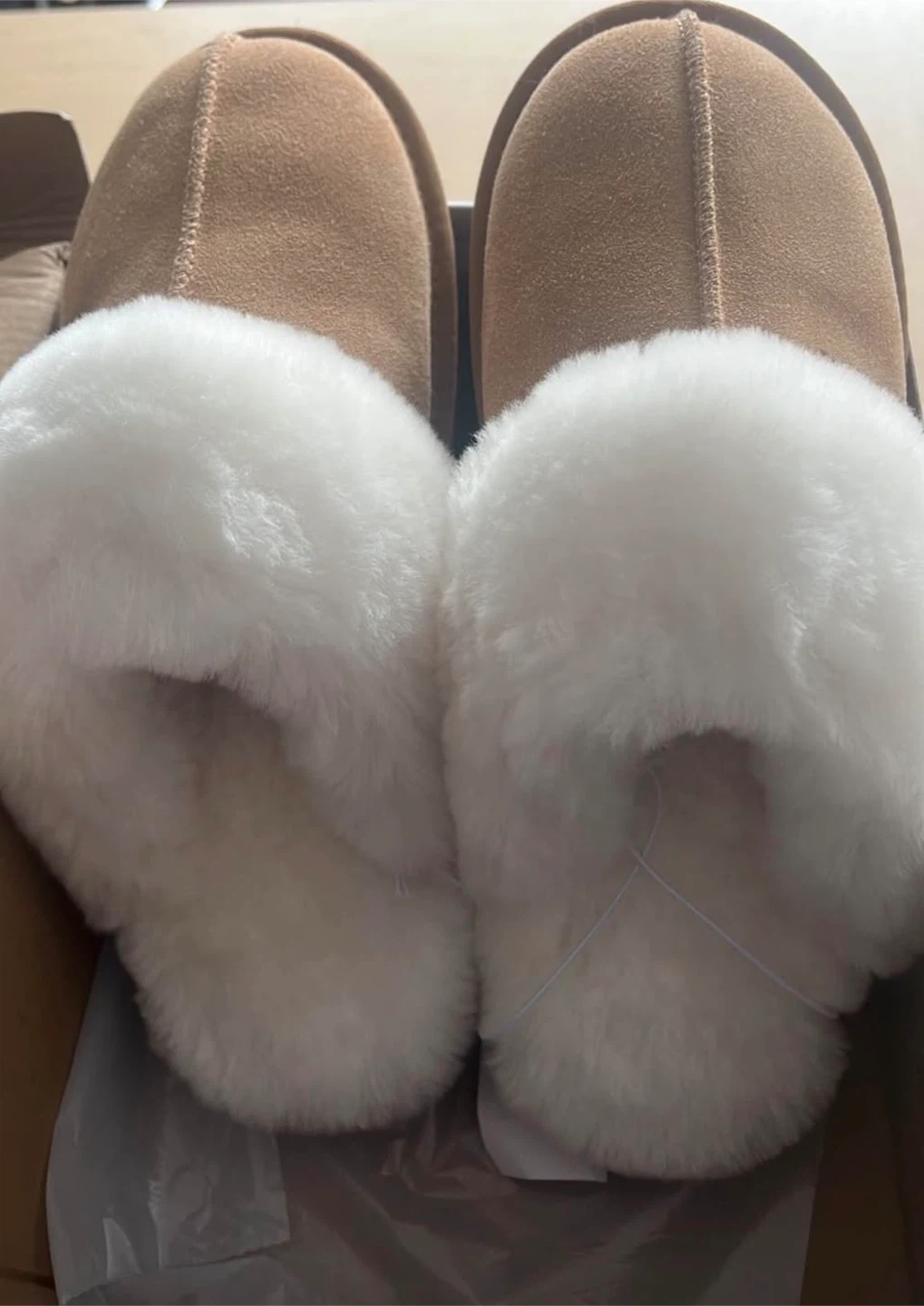 Cozy shearling lined slippers with a soft suede outer. They're perfect for keeping your feet warm around the house. Available in tan or pink.