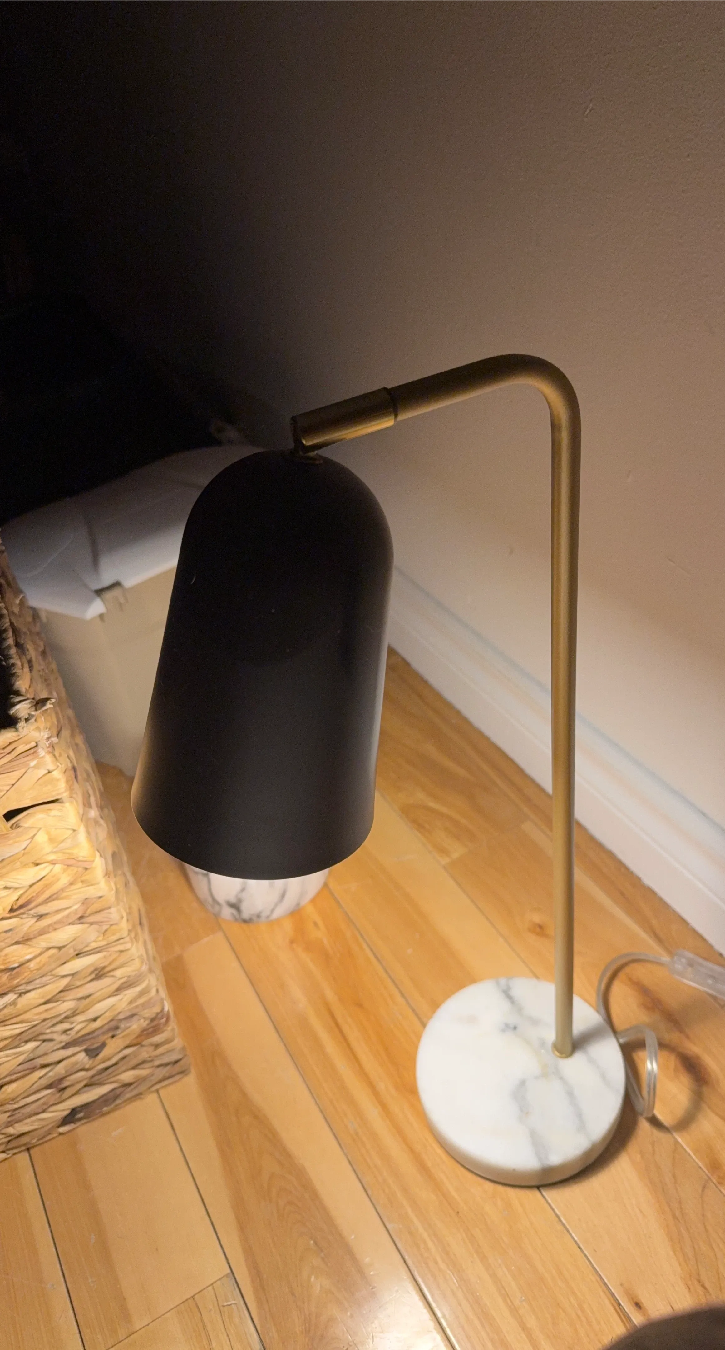 A stylish desk lamp featuring a black dome shade and a white marble base. Its gooseneck design allows for adjustable lighting. This lamp's compact size makes it suitable for desks or nightstands.