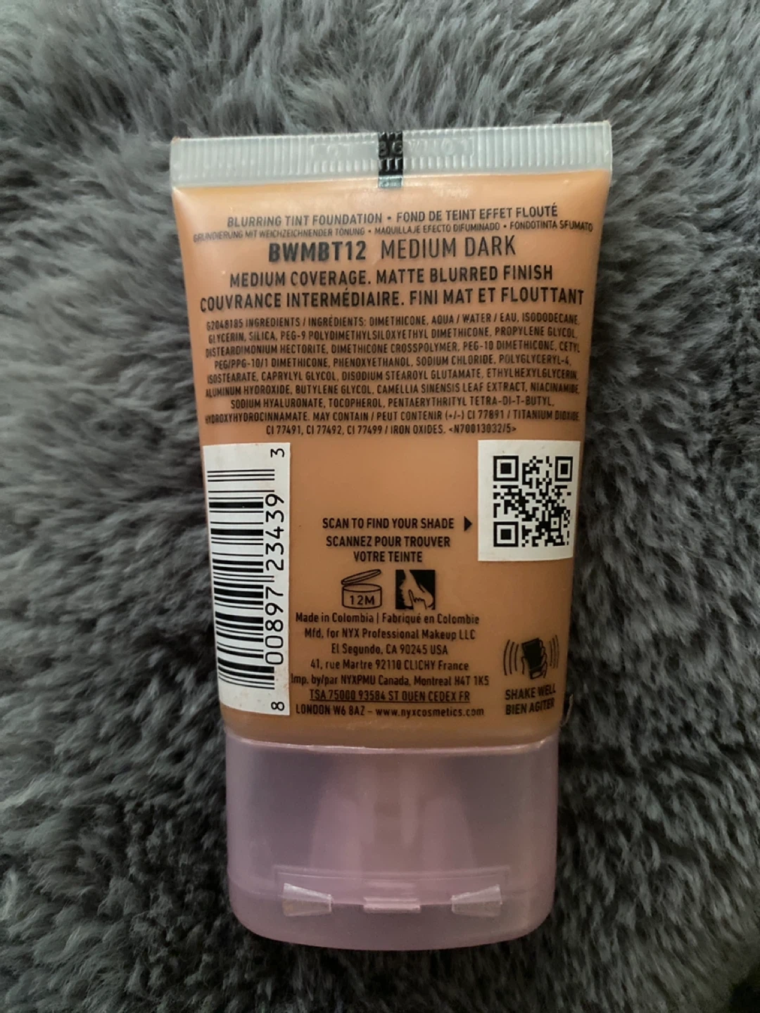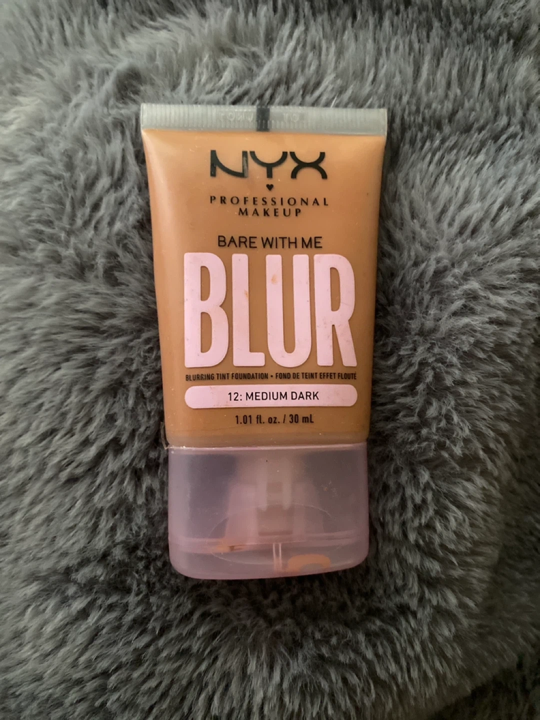 This NYX Bare With Me Blur Tint Foundation is in shade 12, Medium Dark. It's a blurring tint foundation. The bottle contains 1.01 fl. oz. / 30 mL.
