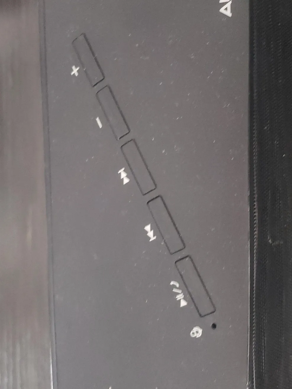 The image shows a close-up of a black electronic device with buttons for volume, playback, and other functions. It appears to be in used condition