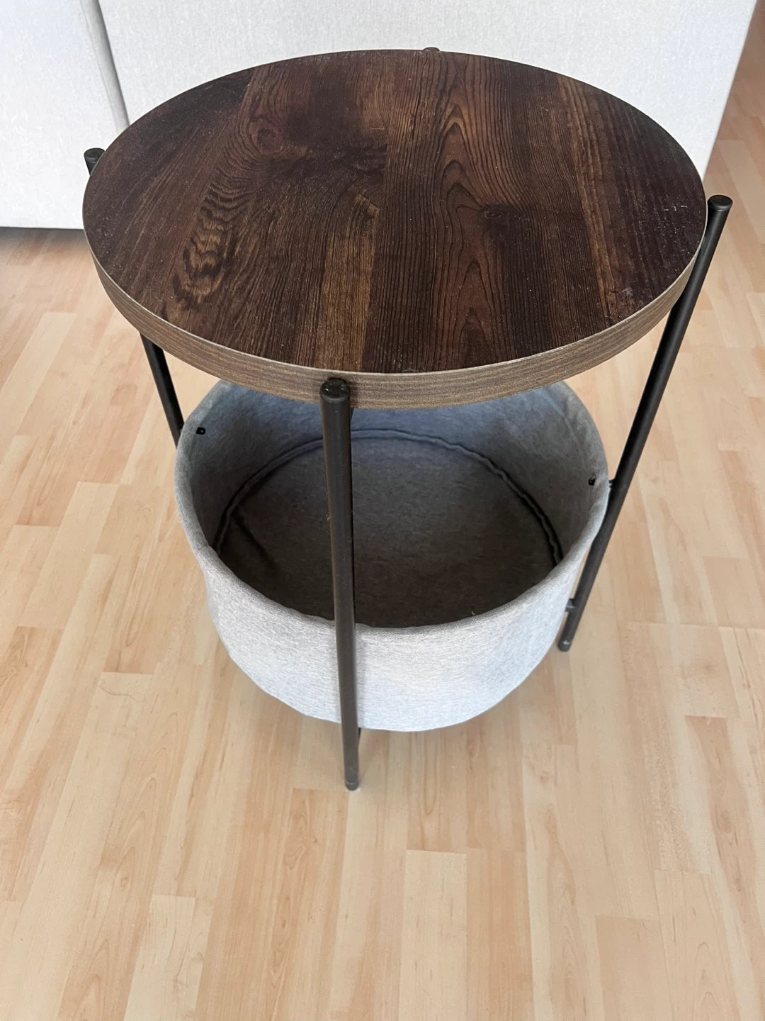 Selling a round side table featuring a dark wood-look top and a handy grey storage basket underneath. Great for keeping things tidy!