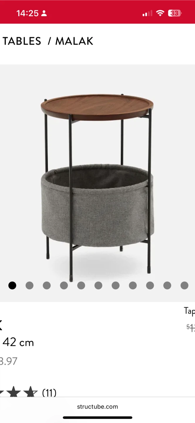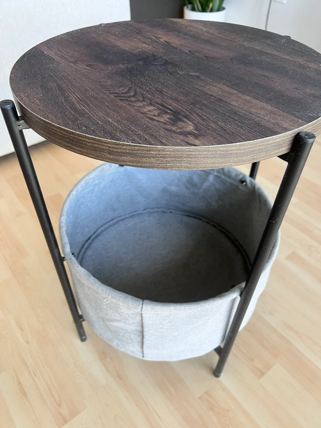 Selling a round side table featuring a dark wood-look top and a handy grey storage basket underneath. Great for keeping things tidy!