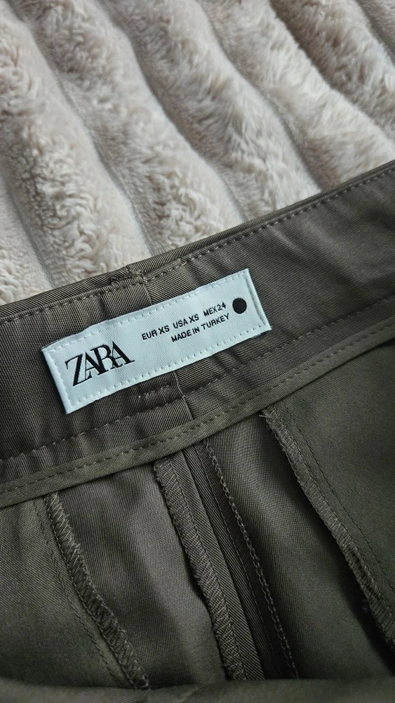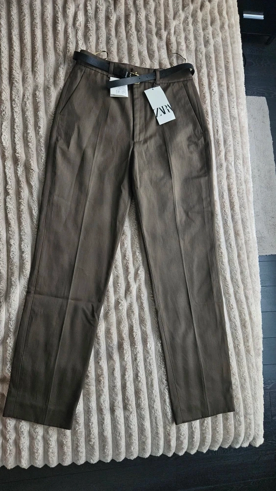Selling a pair of Zara trousers in olive green. They are a size XS and come with a belt. Great for a casual or dressed-up look!