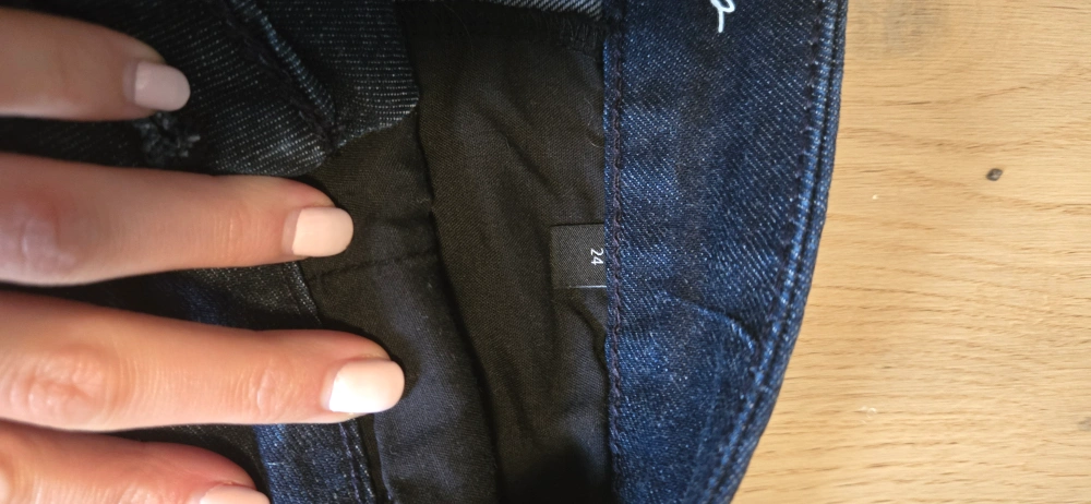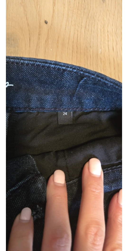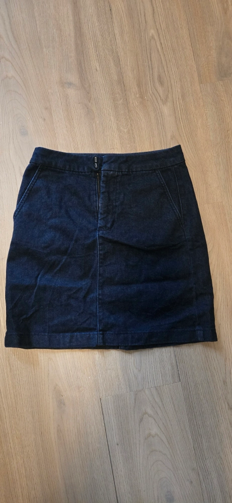 Aritzia denim mini skirt in a dark wash. Size 24. The material is 86% cotton and 14% polyester.