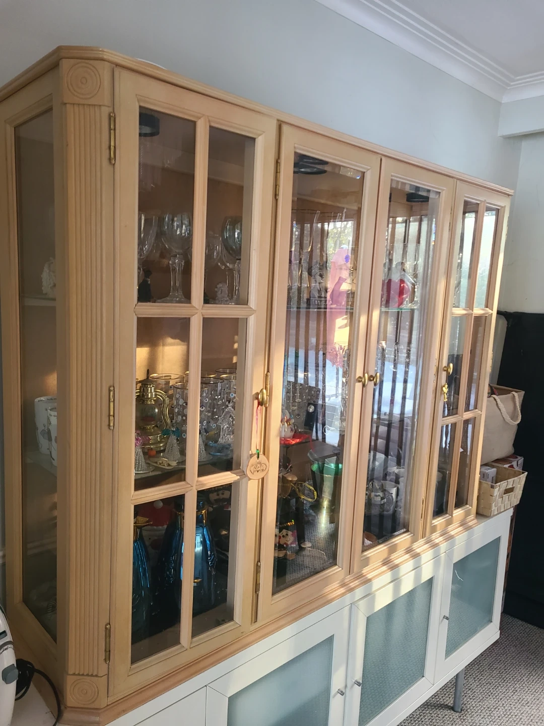 A lovely display cabinet with multiple glass doors and shelving. It's made of light-coloured wood and features decorative detailing on the frame. Great for showcasing collectibles, dishes, or books!