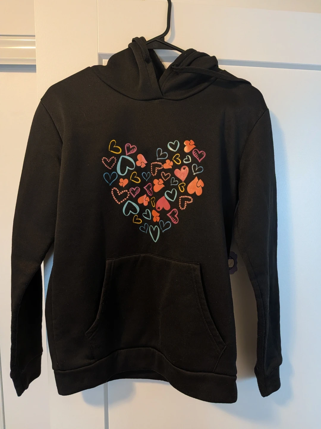 Selling a clothing bundle that includes a black hoodie (Good/$2) with a heart design and a maroon dress (New/$12). Both items are in great condition and ready for a new wardrobe!