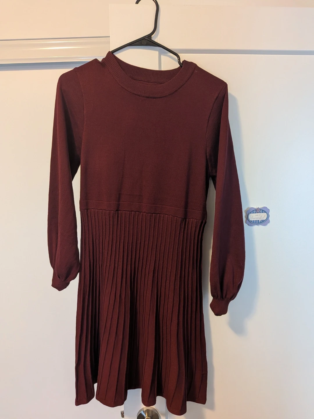 Selling a clothing bundle that includes a black hoodie (Good/$2) with a heart design and a maroon dress (New/$12). Both items are in great condition and ready for a new wardrobe!