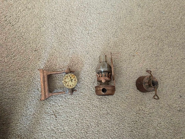 Three detailed miniature pencil sharpeners included: a Mantel/Grandfather Clock with a swinging pendulum and vintage clock face, a Hurricane/Oil Lamp with a clear glass chimney and ornate base, and a Coffee/Grain Grinder with a rotating hand crank. Made of heavy-duty die-cast metal with an antiqued copper/bronze finish. Each has a functional pencil sharpener. Good vintage condition with natural aged patina. The clock face shows some light age-related wear.
