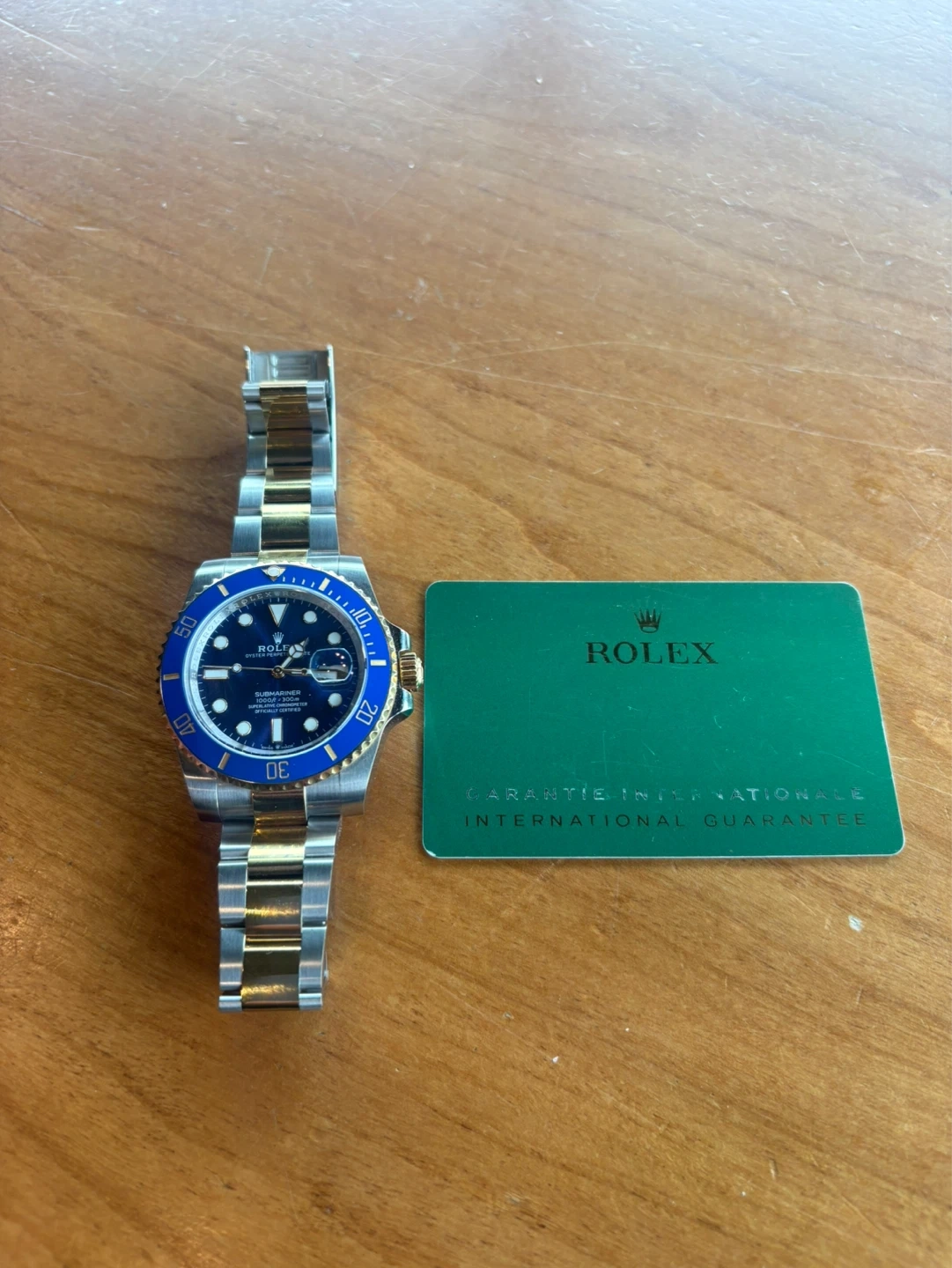 This Rolex Submariner watch is crafted with a stainless steel and gold two-tone design. It features an automatic movement and a blue dial. The international guarantee card is included.