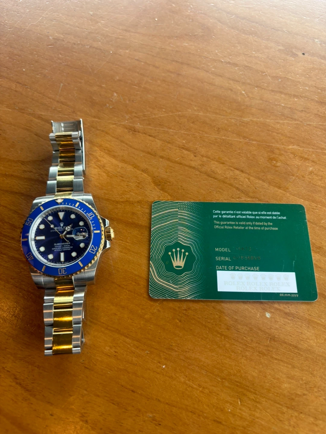 This Rolex Submariner watch is crafted with a stainless steel and gold two-tone design. It features an automatic movement and a blue dial. The international guarantee card is included.