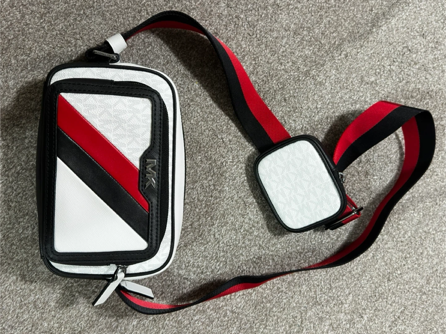 Michael Kors crossbody bag with a white, red, and black stripe design. It has the MK logo pattern on a white section. The strap is red and black.