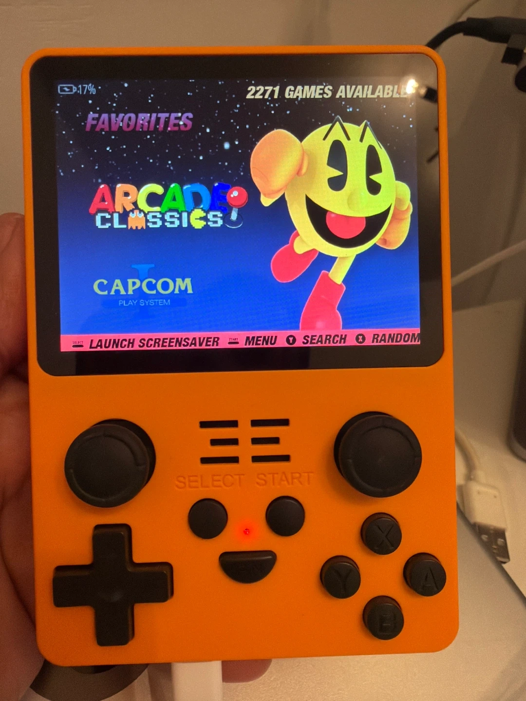 Never used. This orange handheld console comes pre-loaded with thousands of games across various platforms like Nintendo DS, Game Boy, and Arcade Classics. It's a great way to revisit classic gaming on the go. Includes a USB charging cable. Selling as I’m not a gamer