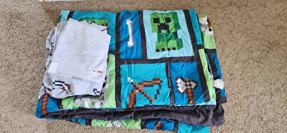 Minecraft twin comforter set includes: 1 pillow case, 1 flat sheet, 1 fitted sheet, and 1 comforter. Selling for $30. Pick up in Hanover, or possibly in Woodstock depending on timing.