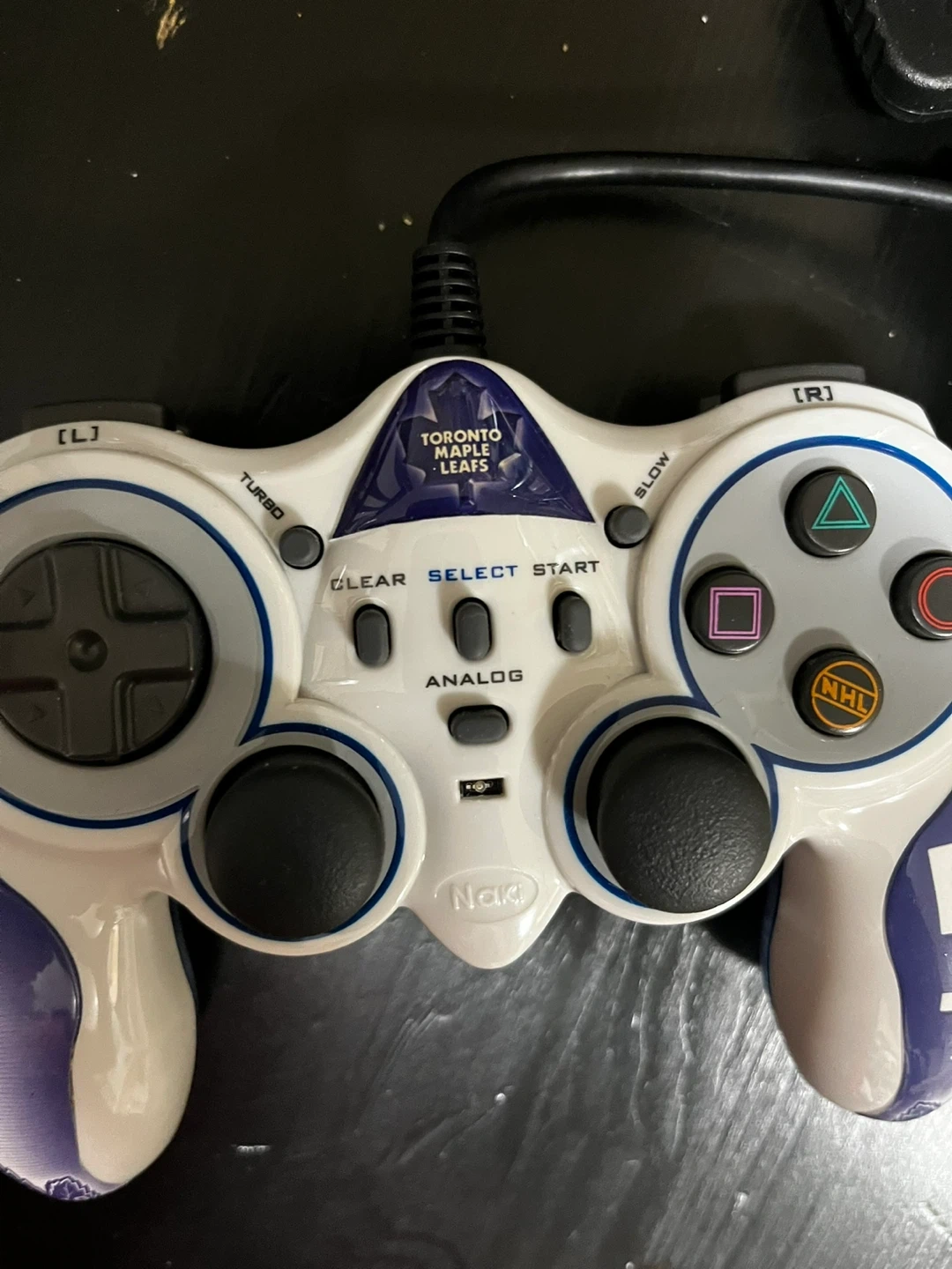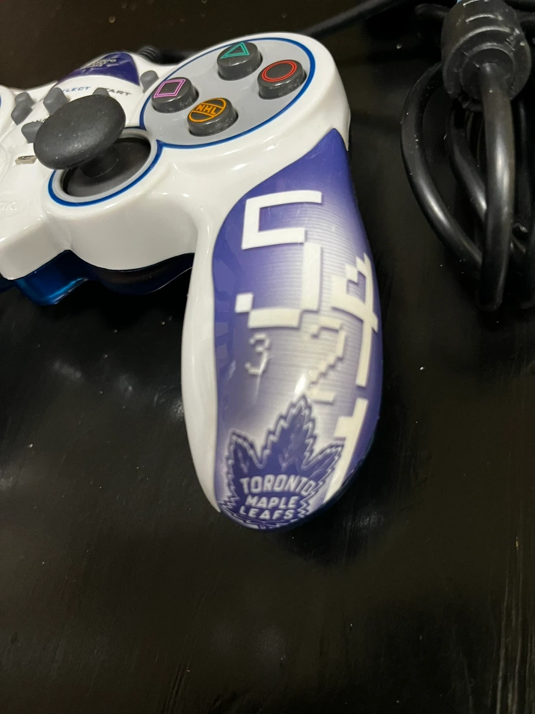 This item is a collectible Naki NHL Toronto Maple Leafs Wired Analog Controller designed for the Sony PlayStation 2.