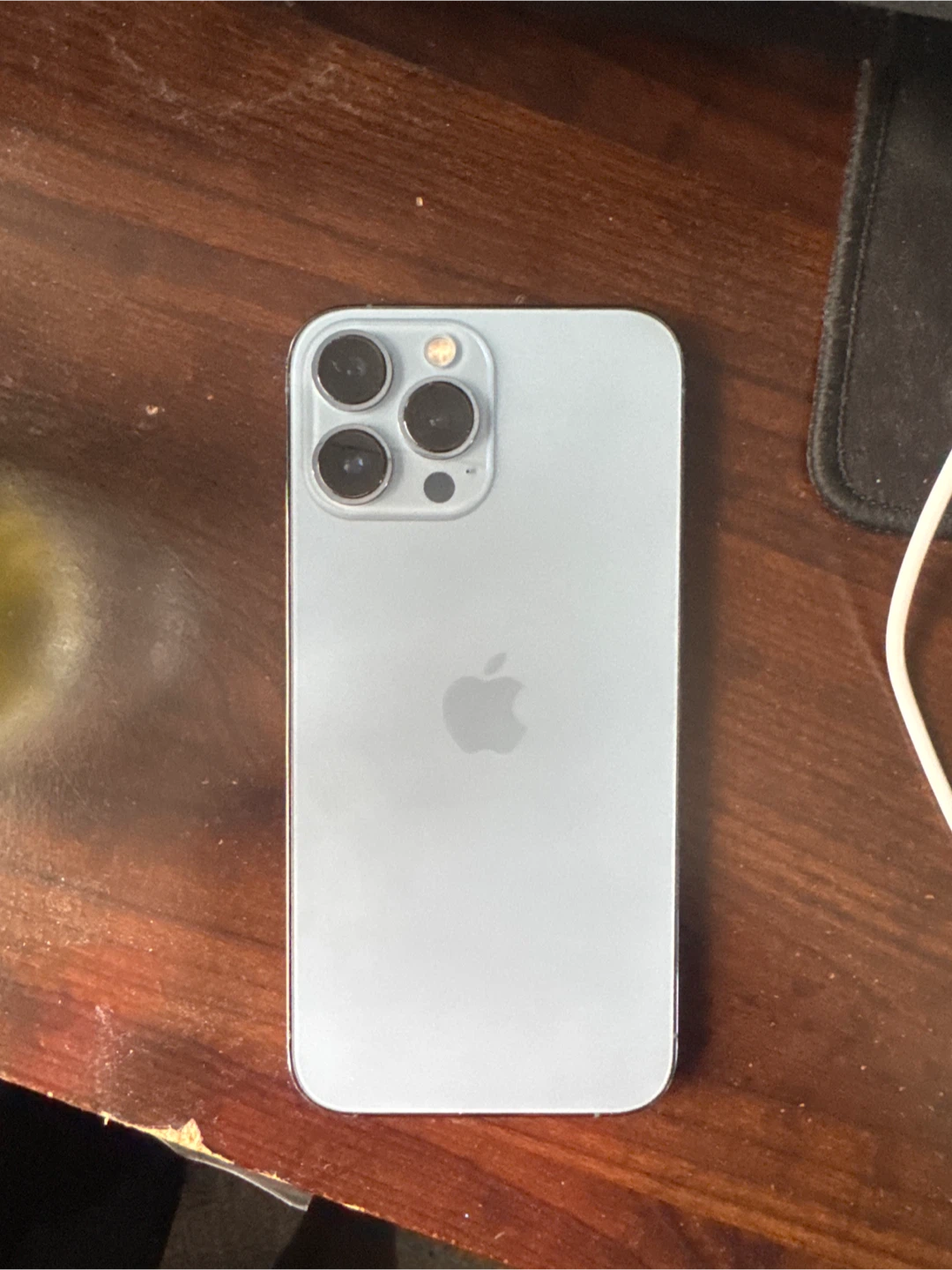 Apple iPhone 13 Pro phone. It's a light blue colour. The phone has a large camera system on the back. It's powered on and showing the country selection screen.