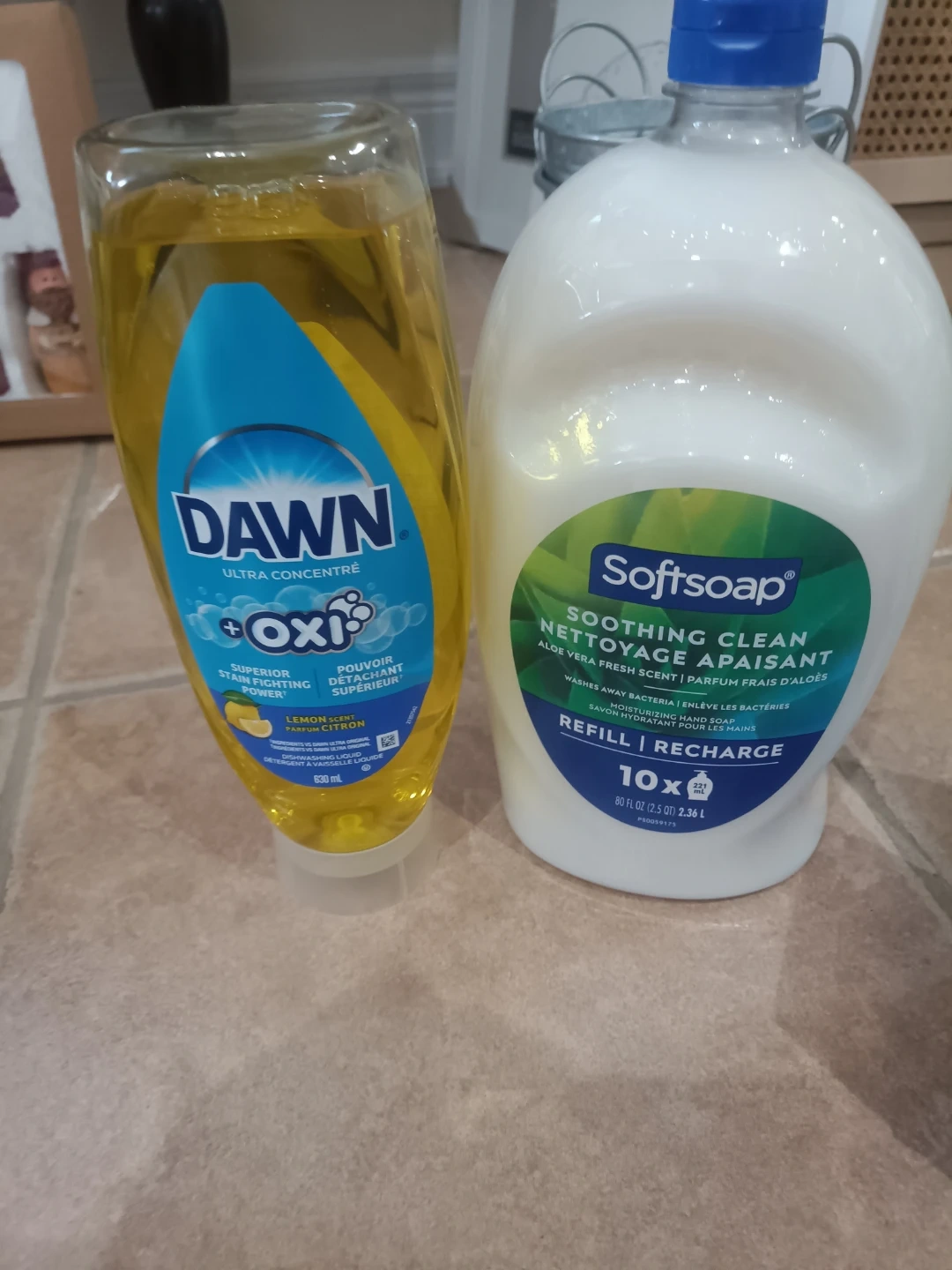 Dawn Ultra Concentre Oxi dishwashing liquid in Lemon scent, 630 ml. Softsoap Moisturizing Hand Soap refill, Soothing Clean Aloe Vera Fresh scent, 80 FL OZ (2.36 L). These are household cleaning essentials.