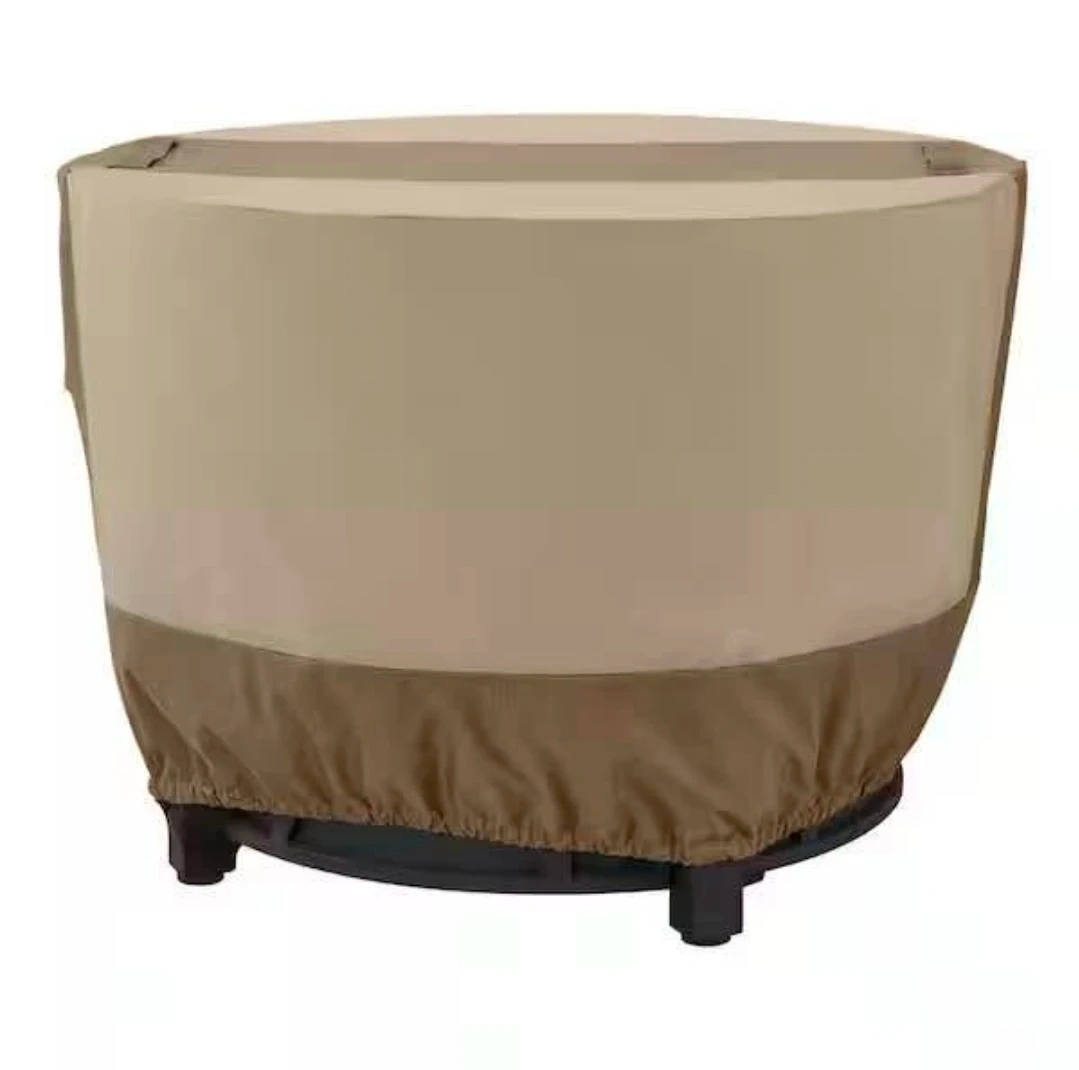 This Hampton Bay universal round fire pit cover is made from durable fabric. It features built-in buckles for a secure fit. It also includes padded handles for easy removal.