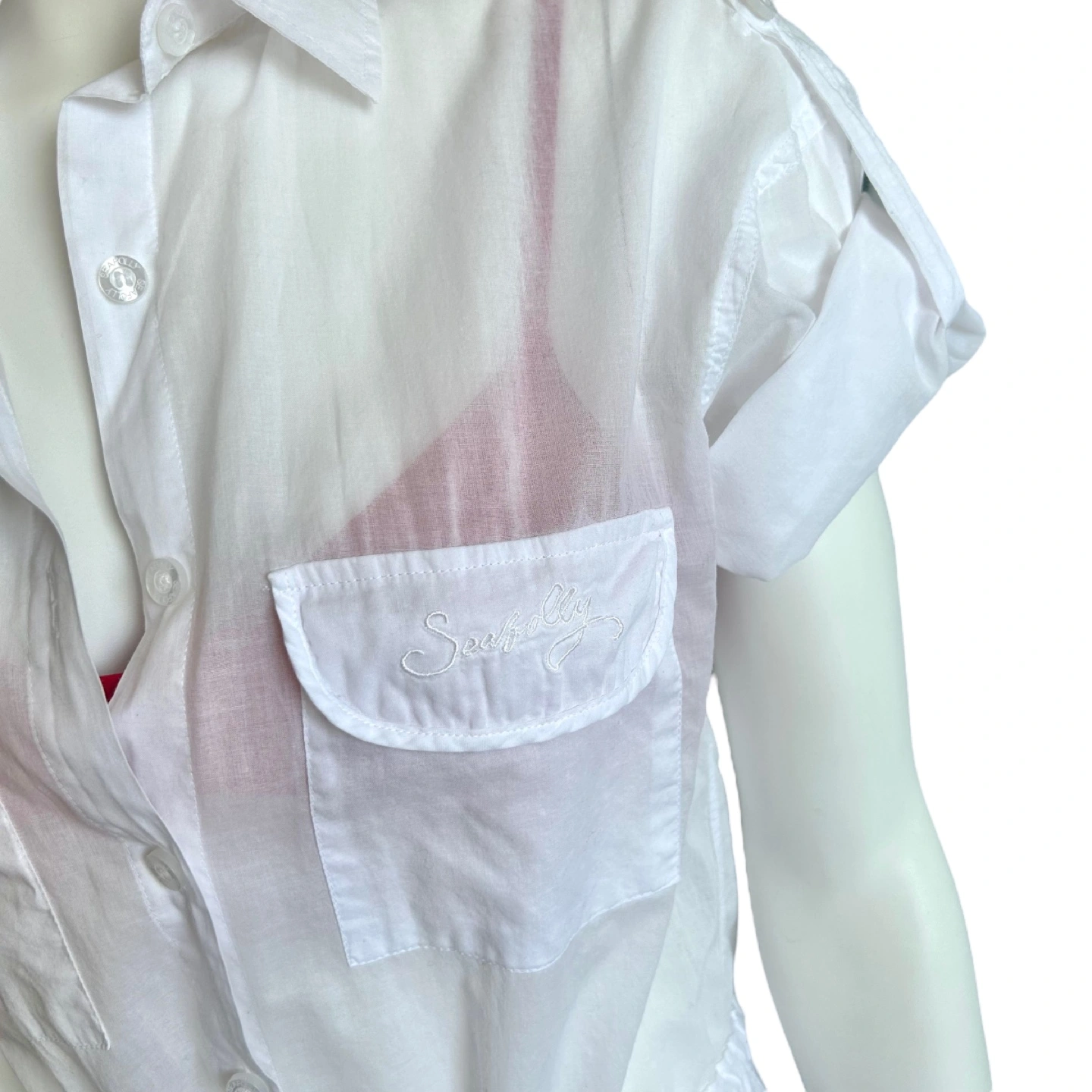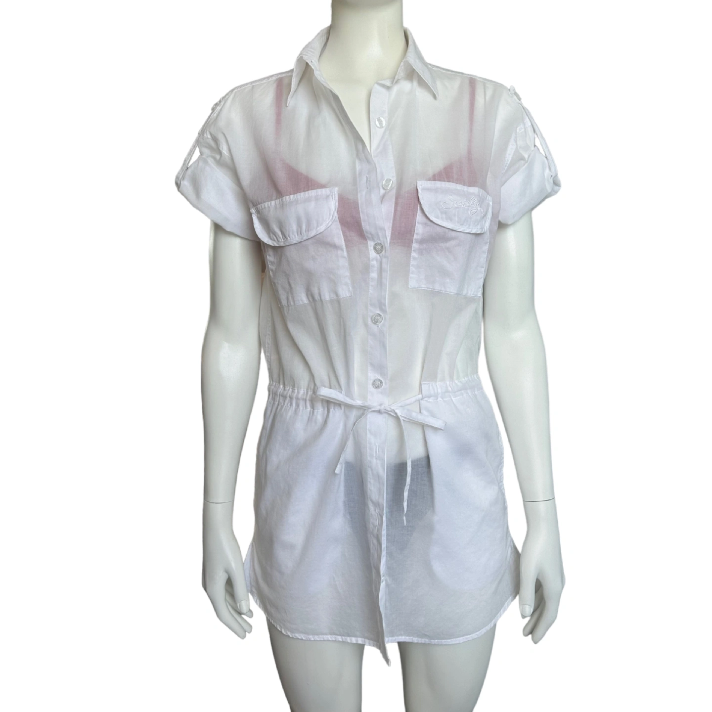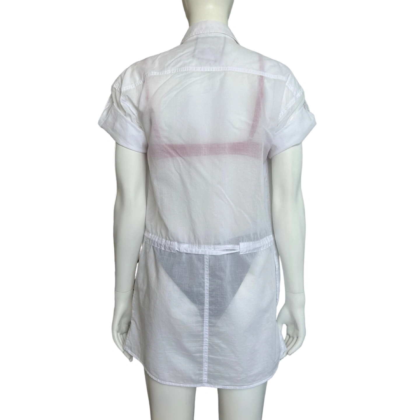 Designer shirt-dress beach coverup in a sheer white cotton by Seafolly. Features two flap breast pockets, hip pockets, drawstring tie at waist, and roll tab sleeves. Size XS.