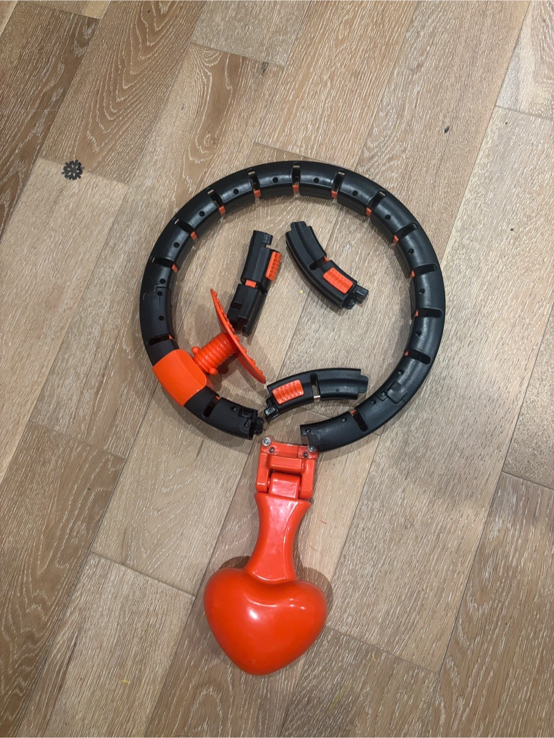 This is an adjustable weighted hula hoop with segment links. It's black with orange accents and features a heart-shaped counterweight. The segments can be added or removed to customize the size. Comes with two ankle weights if you want! Not pictured