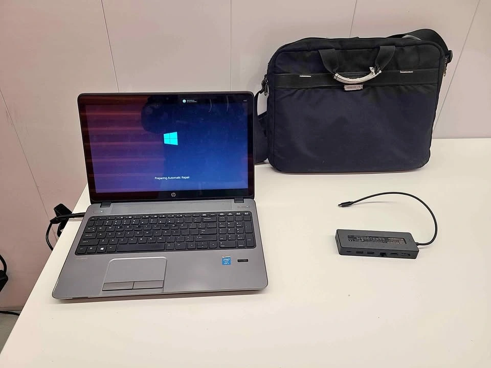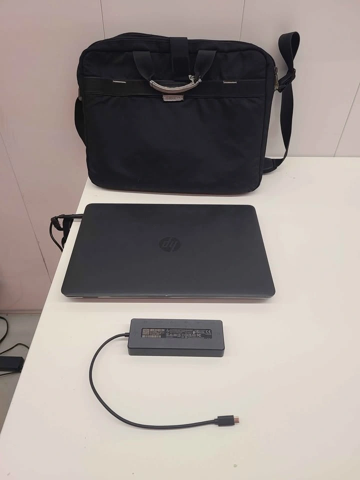 It comes with the charger, a carry bag, and an HP Universal USB-C Multiport Hub (Model 50H55AA).