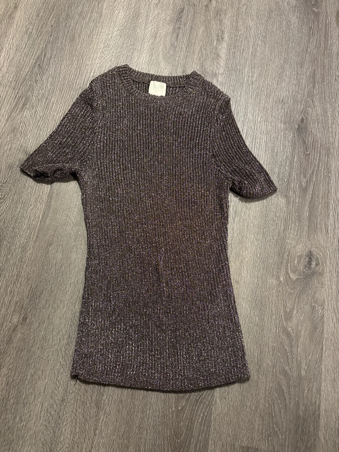 Here's a cute ribbed knit short sleeve top! It's in great condition and ready for a new home. The material has a subtle shimmer to it.