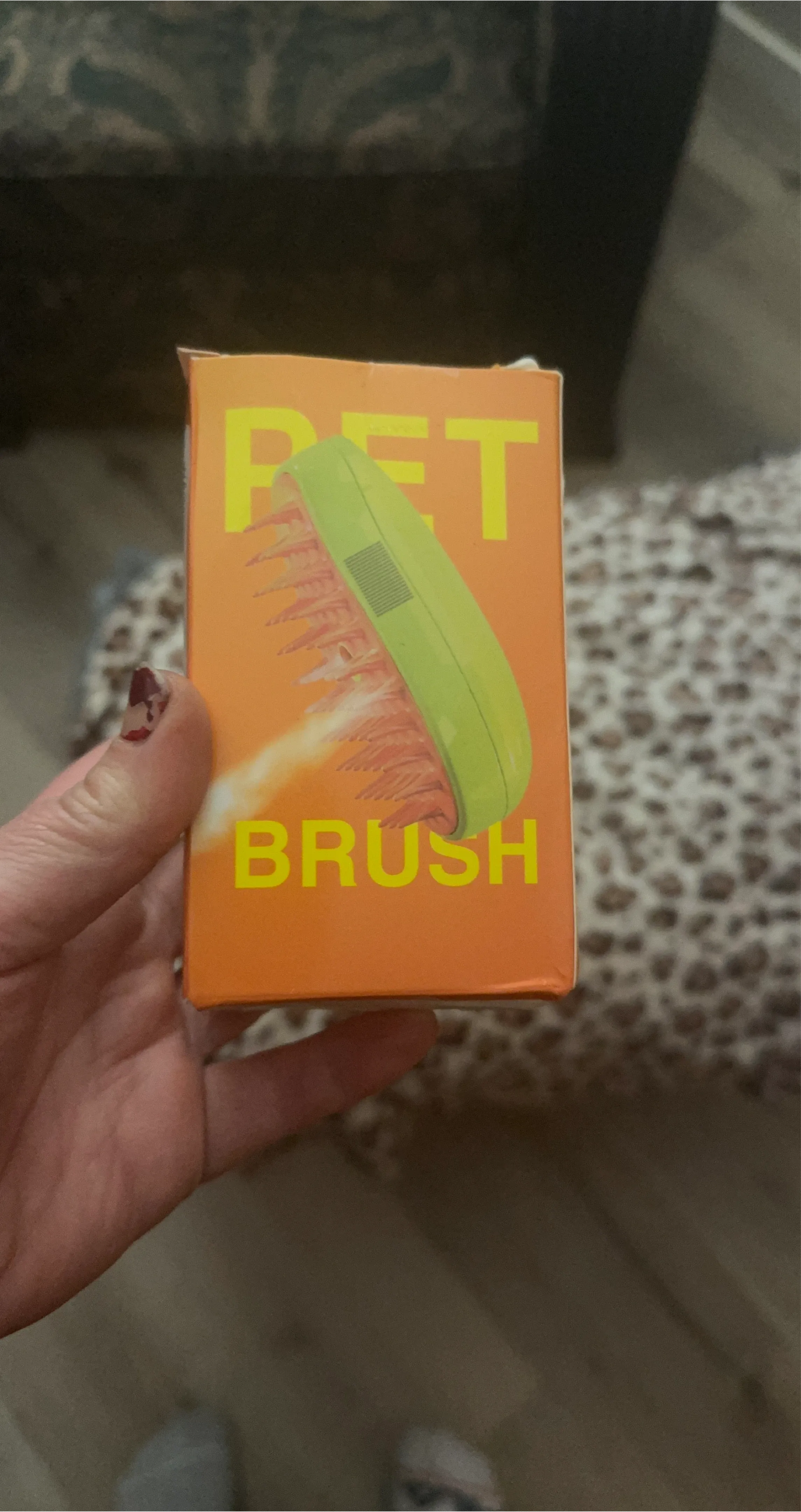 This is a pet brush for grooming. It has a green handle and orange bristles. It's designed for easy filling and effective pet grooming for cats or dogs with long hair. It lights up and sprays a cool mist while brushing with one click. comes with charge cord