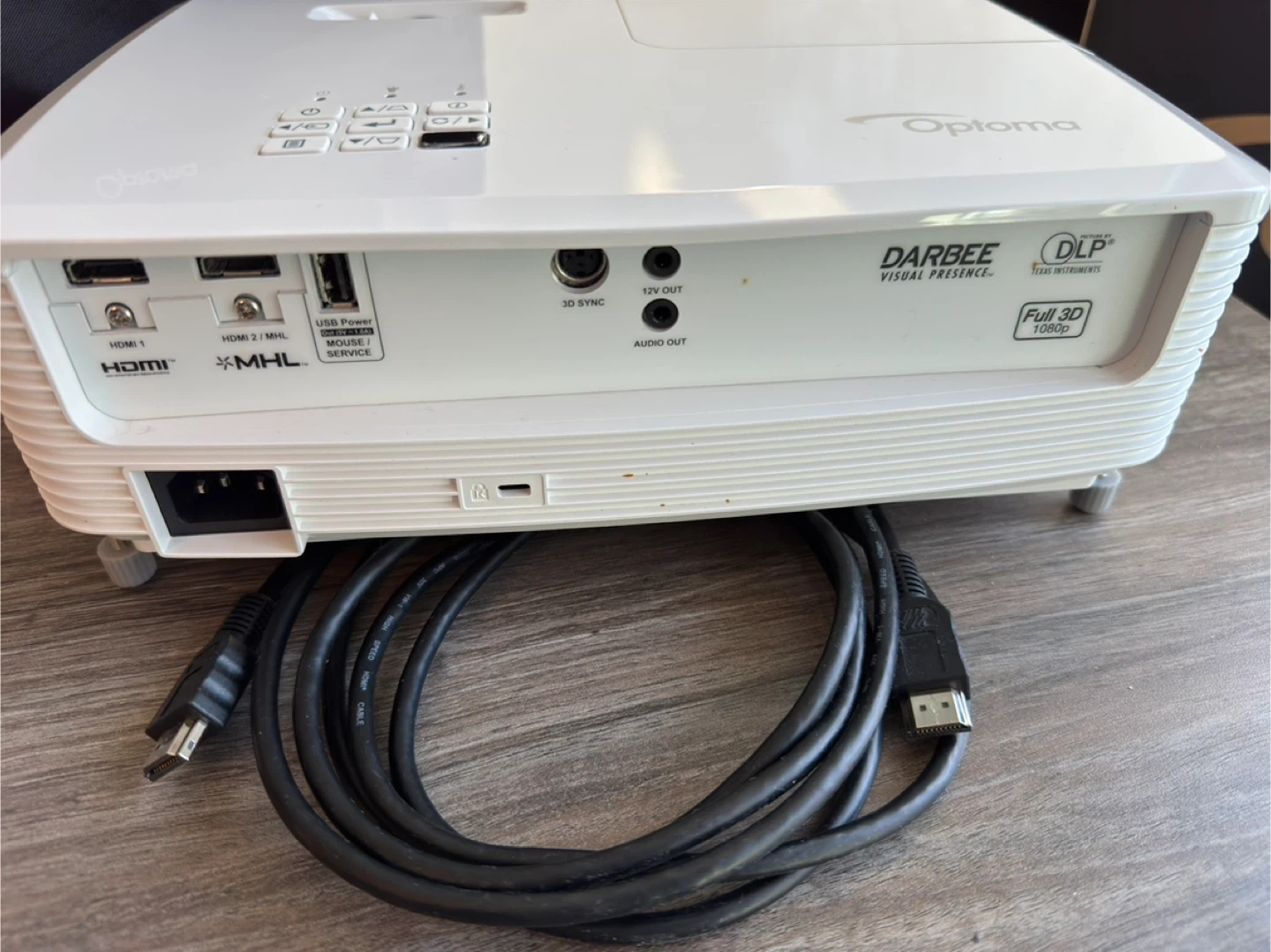 Optoma projector with Darbee Visual Presence technology. It's Full 3D 1080p resolution. Includes HDMI 1, HDMI 2/MHL, and USB power out ports. This projector is great for movie nights and presentations.