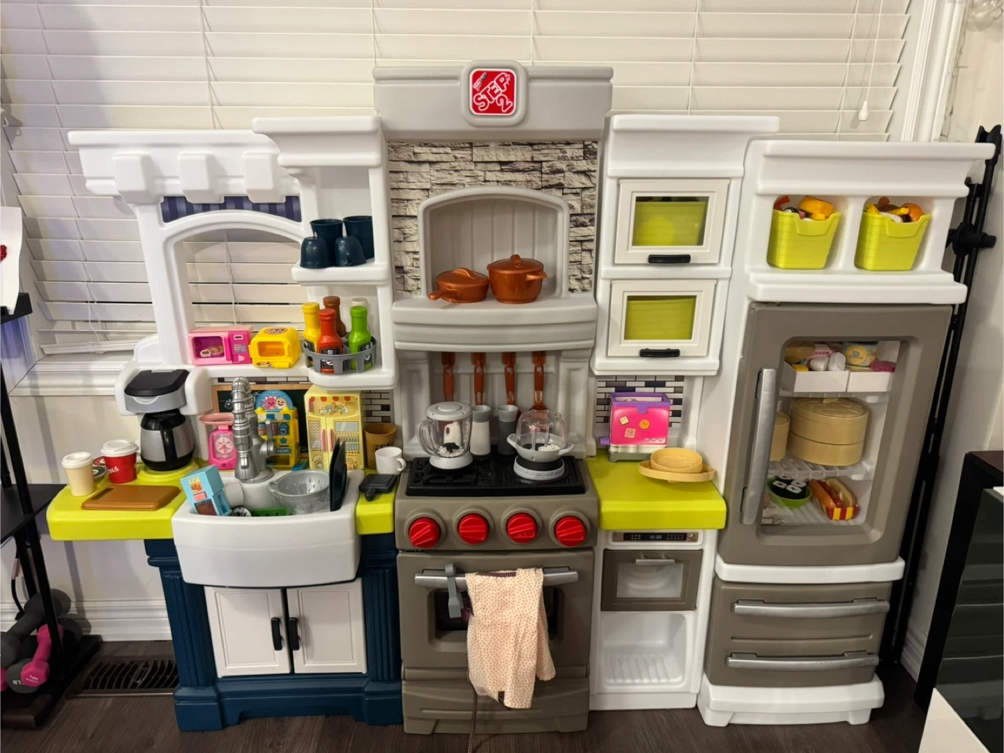 Step2 play kitchen set fridge with light and cooking sounds. with tons of extra bought accessories including food, pots, pans, blender, toaster, and fridge items. It even comes with a cute apron for your little chef! This kitchen encourages imaginative play and culinary fun.