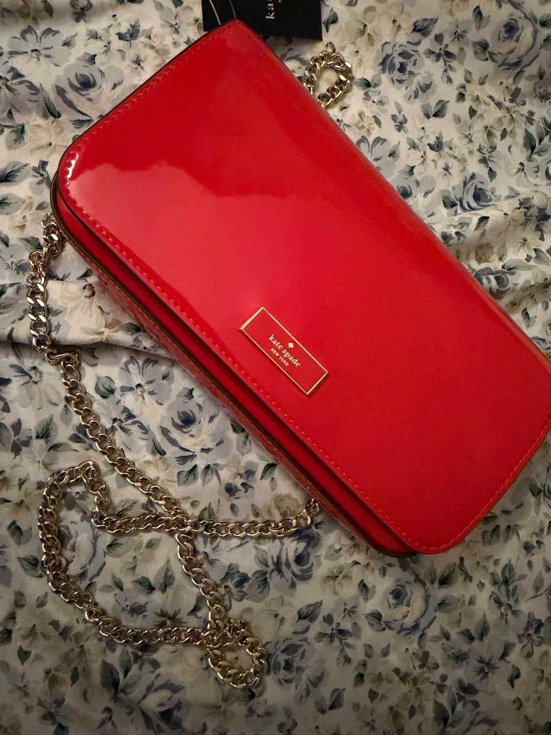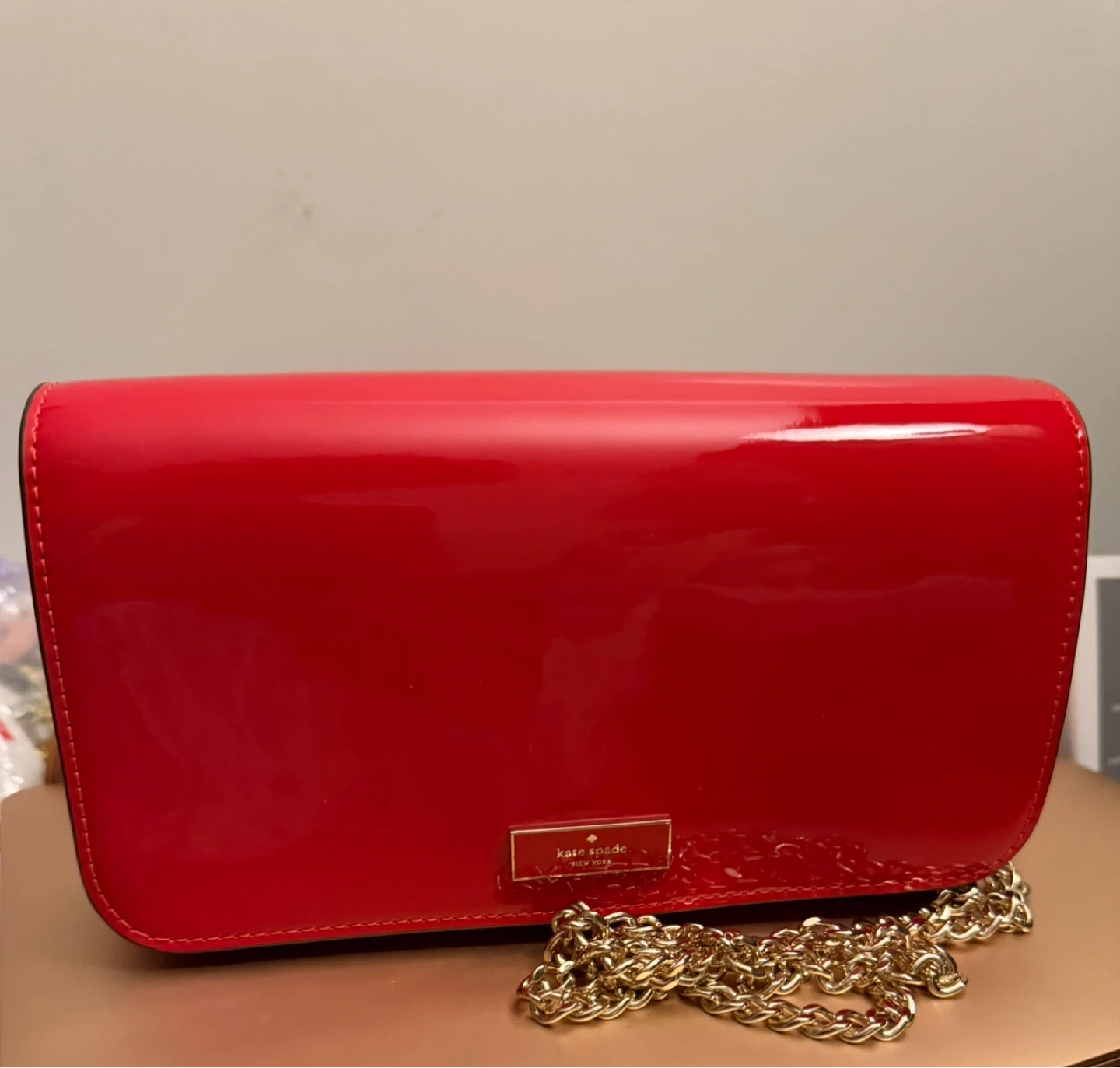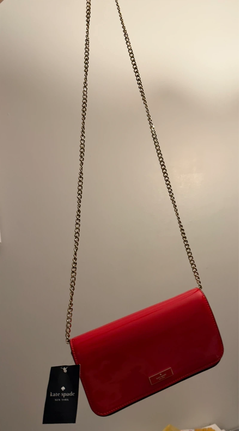 Bright red Kate Spade wallet with a shiny patent leather finish. It features a classic flap closure and a gold chain strap for shoulder or crossbody wear. This stylish accessory is perfect for a night out or for adding a pop of colour to any outfit!