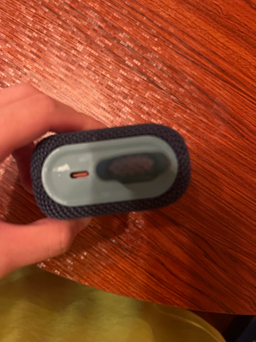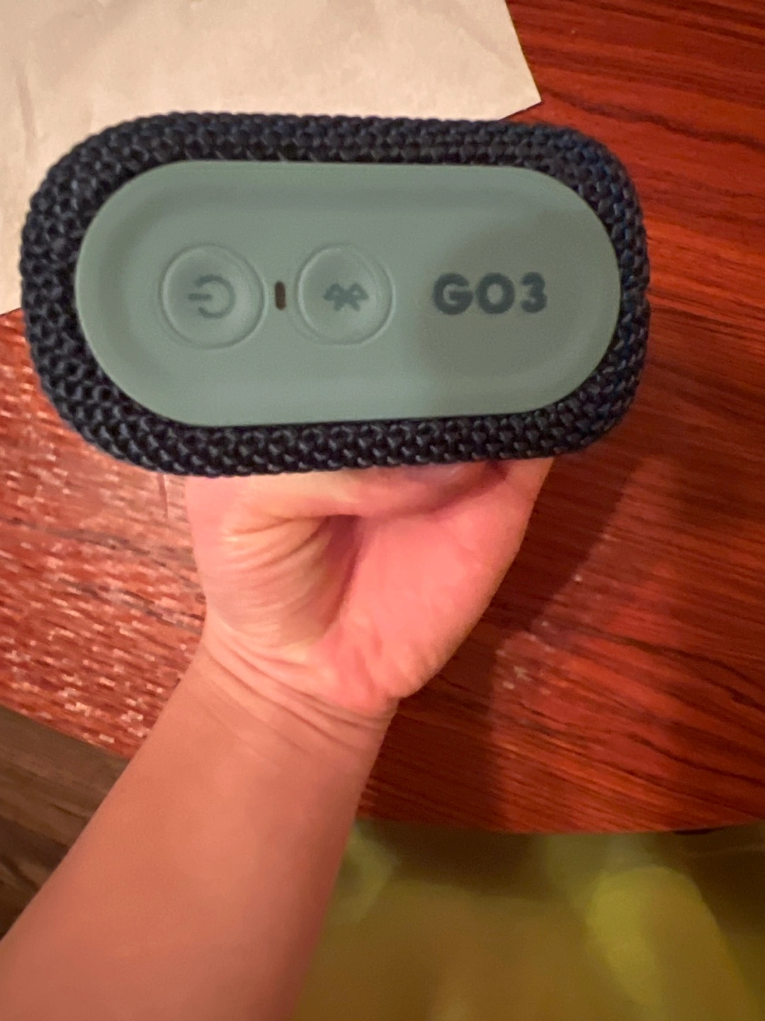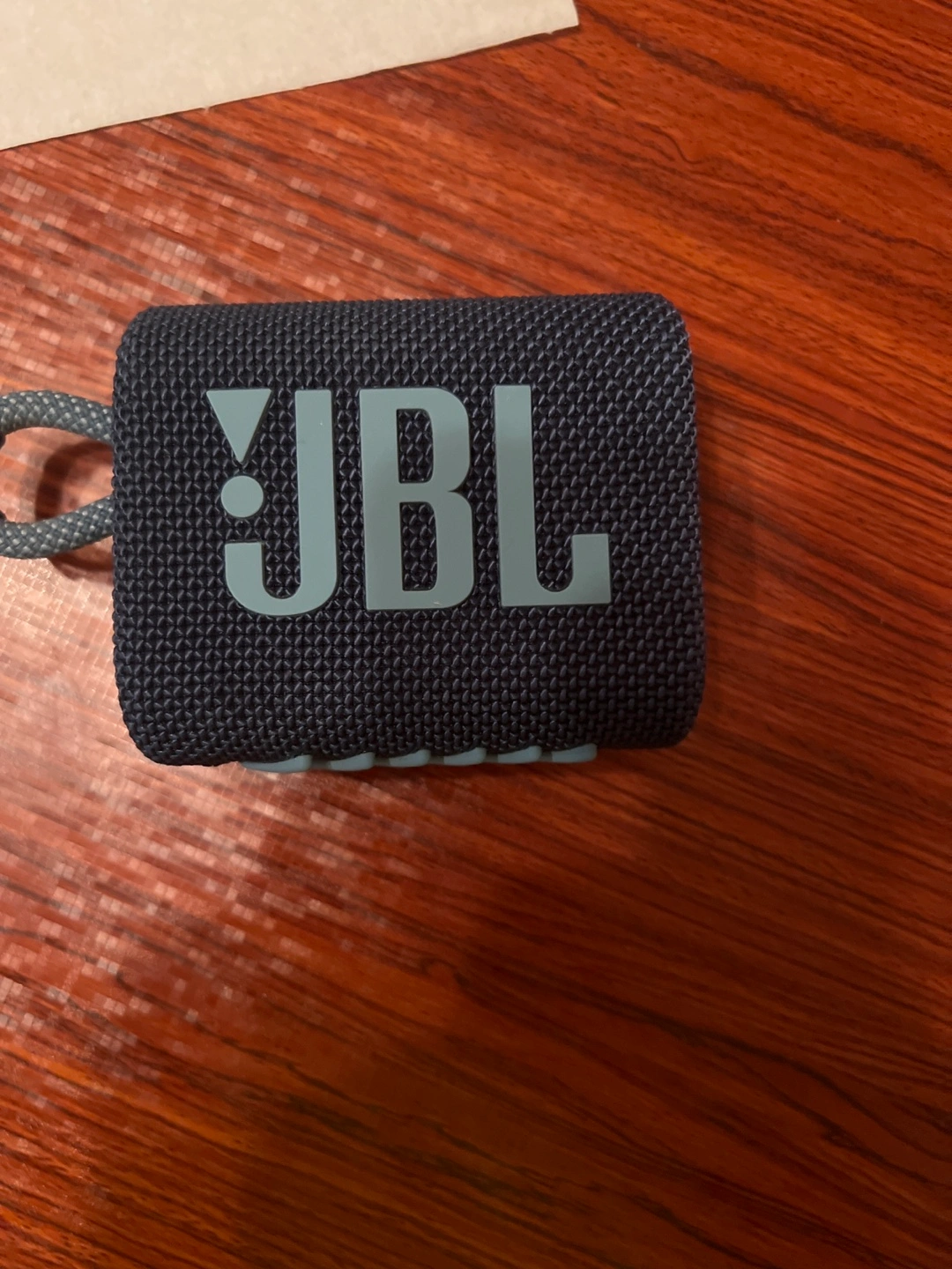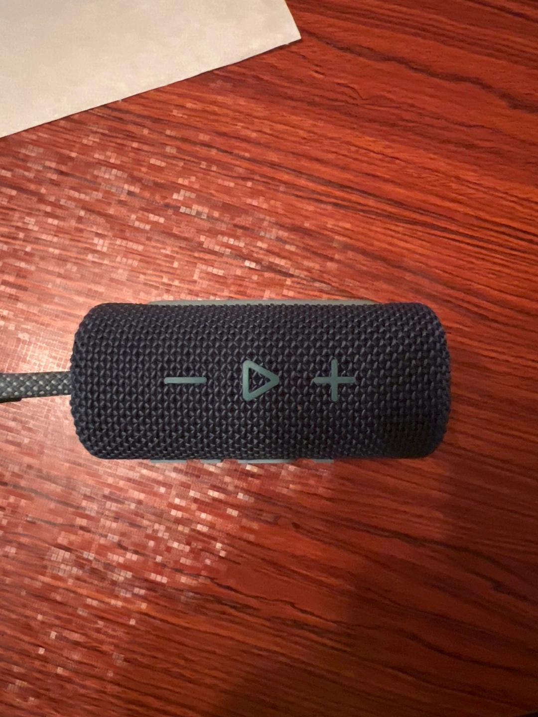 Portable Bluetooth speaker. Compact and lightweight design. Features volume controls and play/pause button. Durable fabric exterior. Good sound quality.