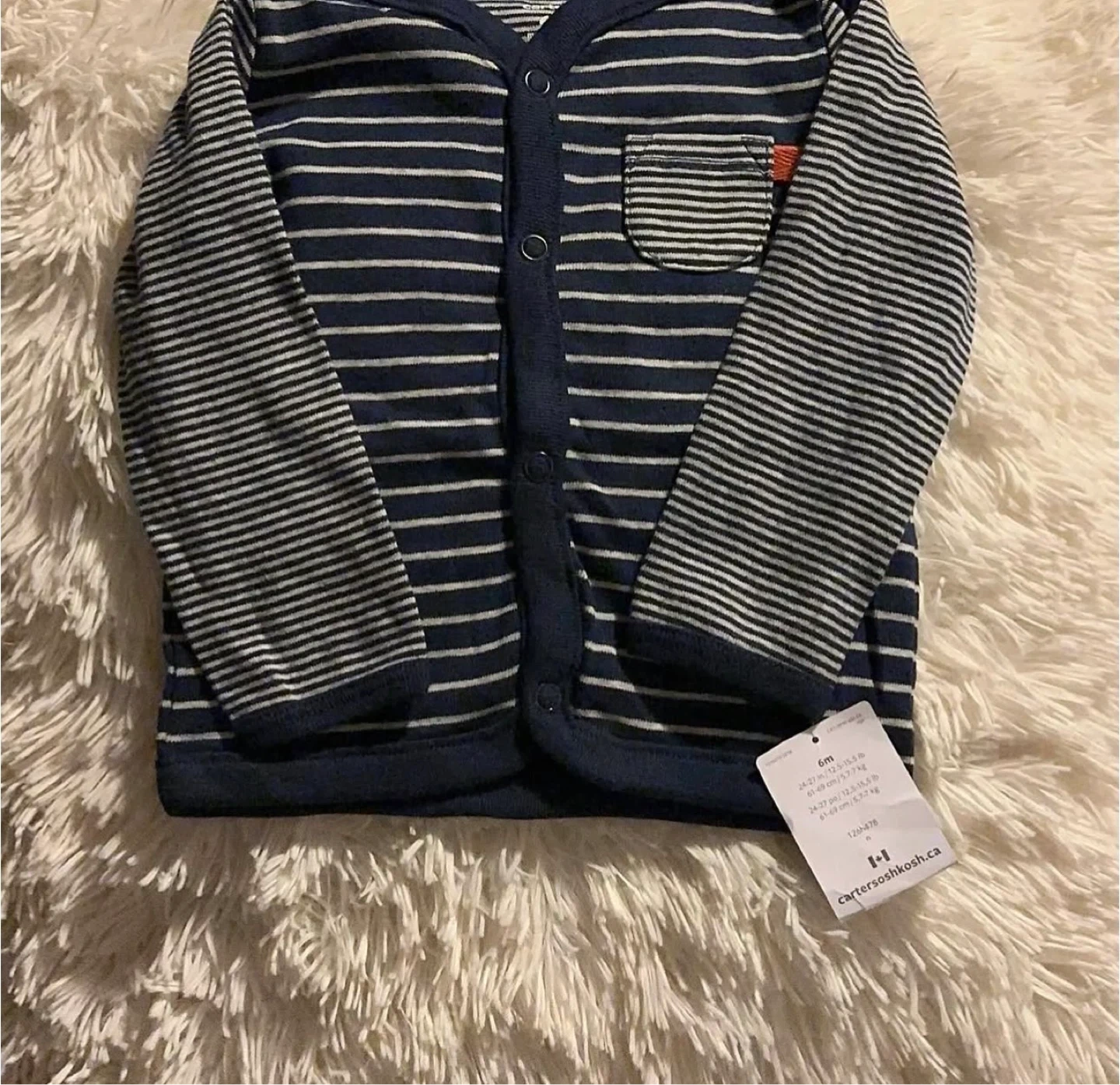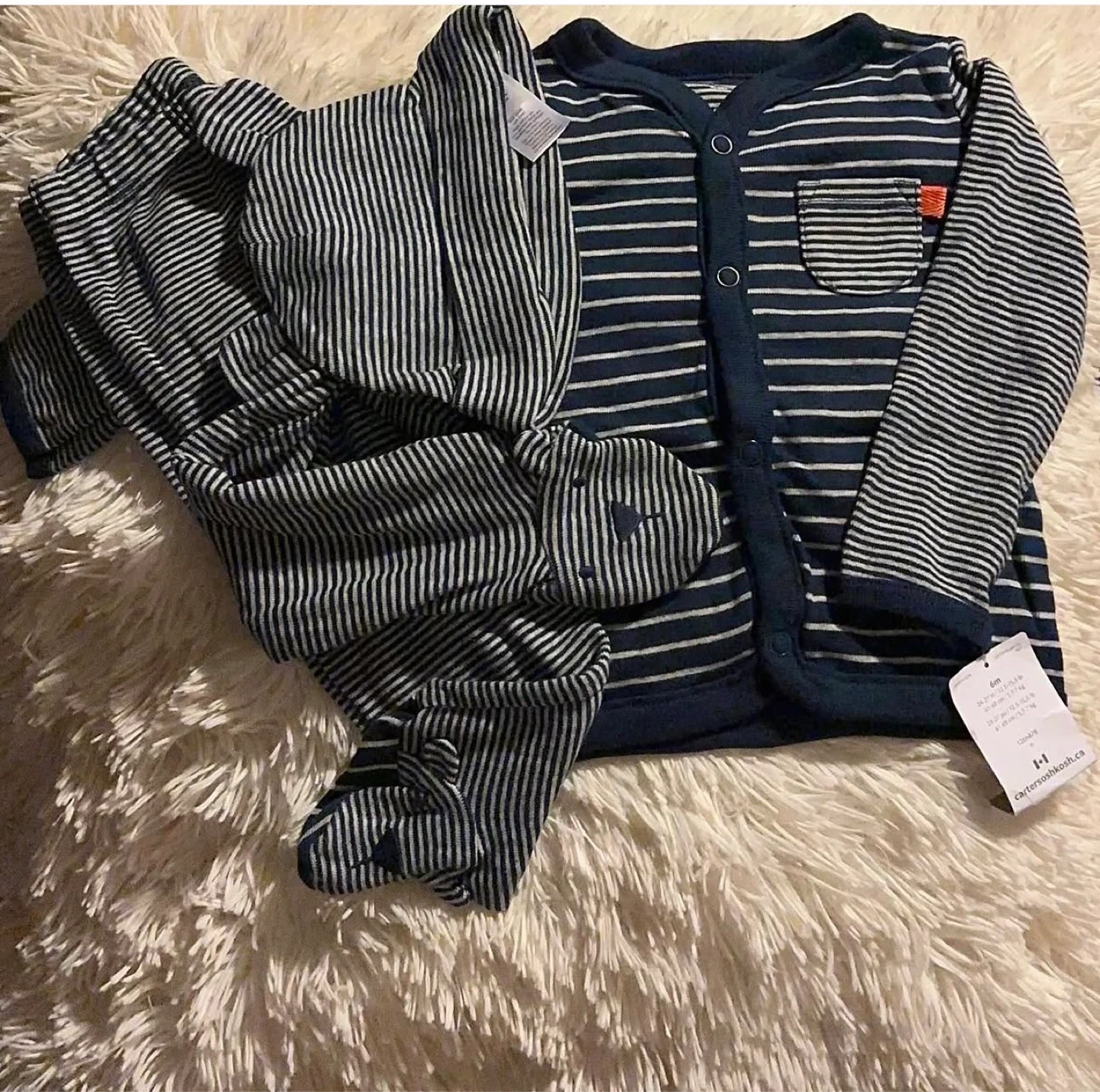 This adorable Carter's 6-month-old outfit is perfect for your little one, featuring a soft, striped design and comfortable fit. This set is new with tags and includes a cardigan, footed pants, and a matching hat.