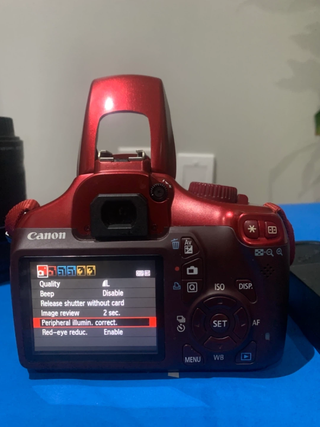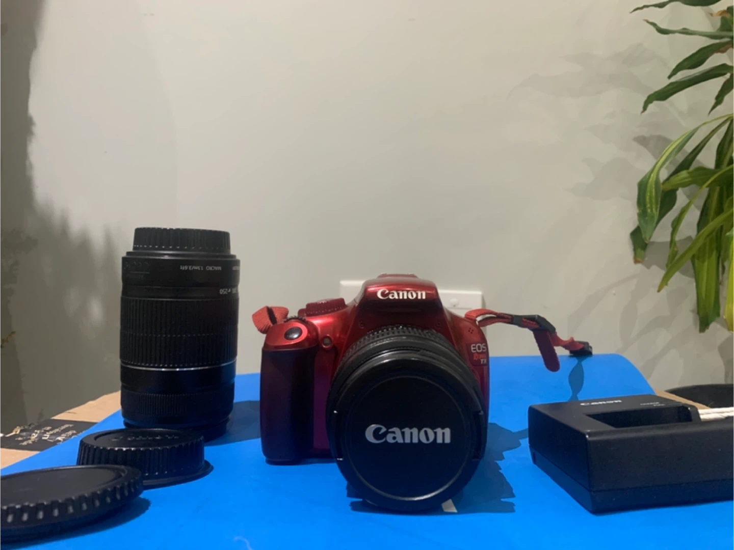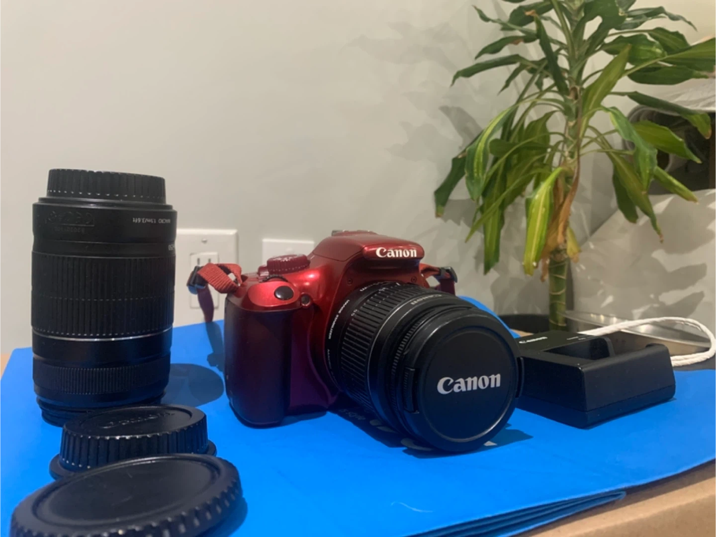 Selling a Canon EOS Rebel T3 DSLR camera in red. It comes with the lens, charger, bag and lens caps. Great for photography enthusiasts!