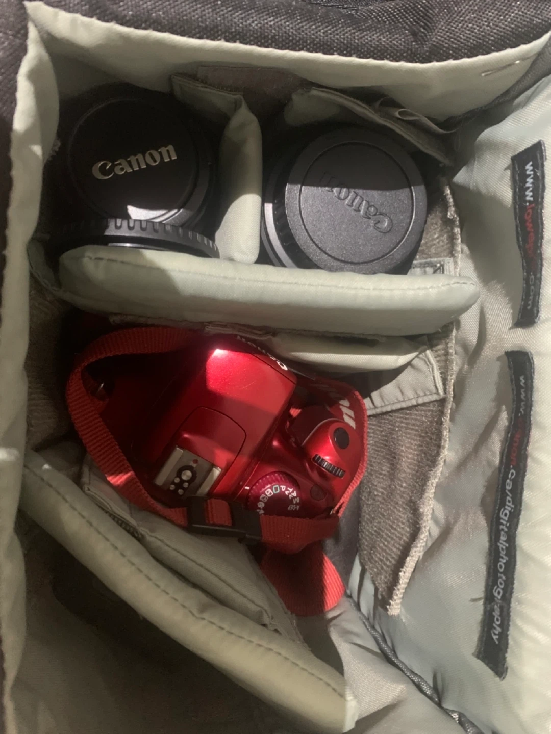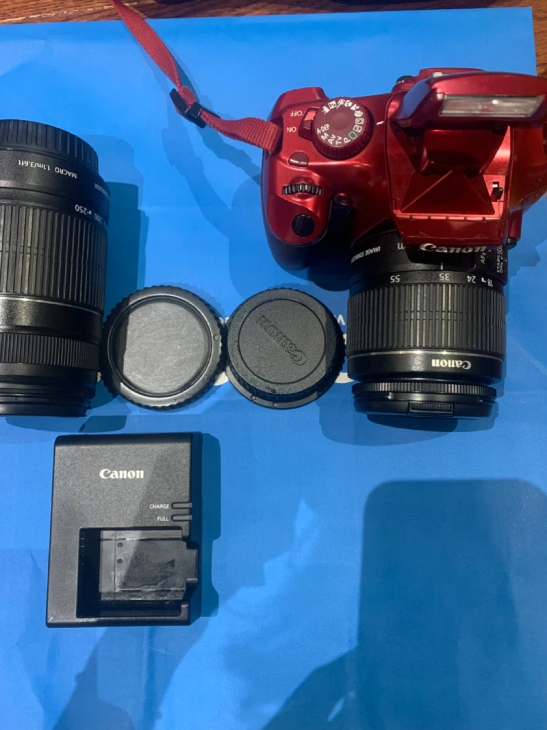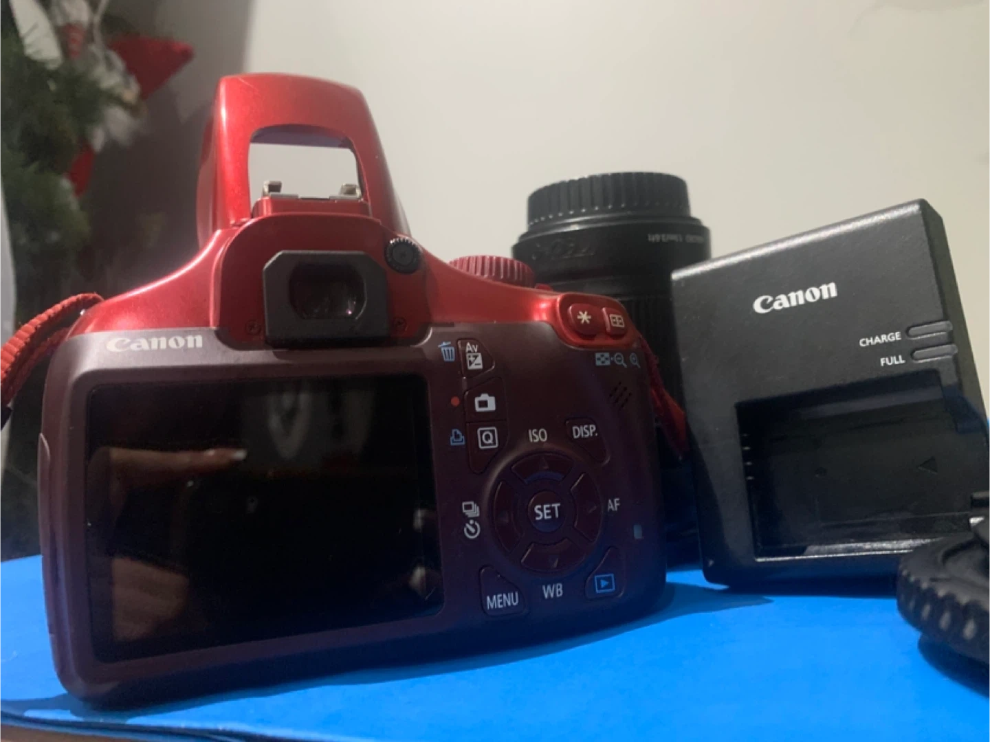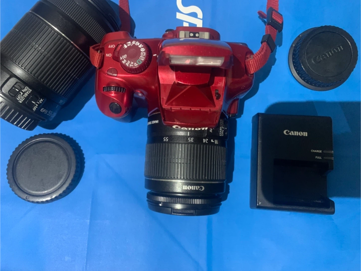 Selling a Canon EOS Rebel T3 DSLR camera in red. It comes with the lens, charger, bag and lens caps. Great for photography enthusiasts!