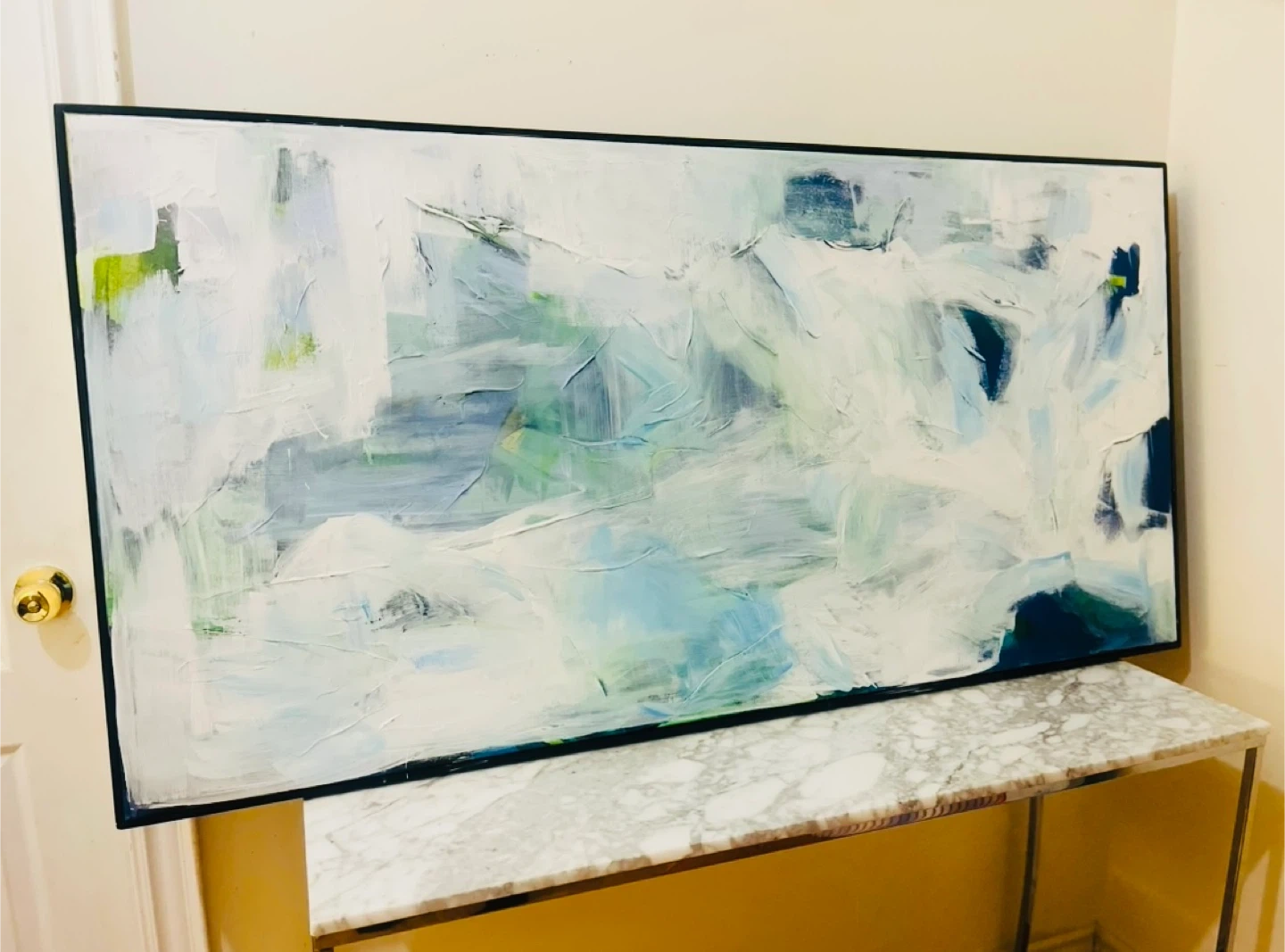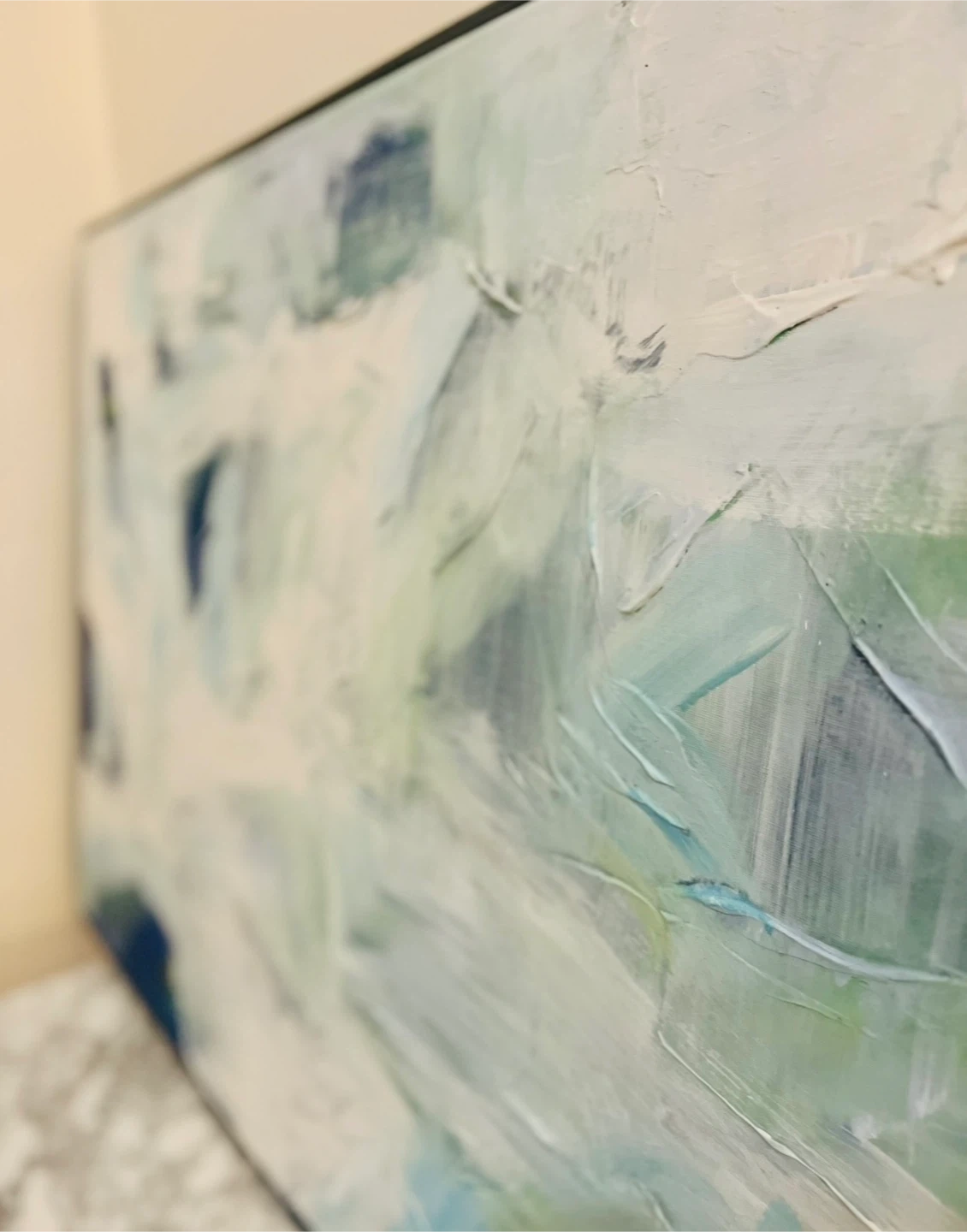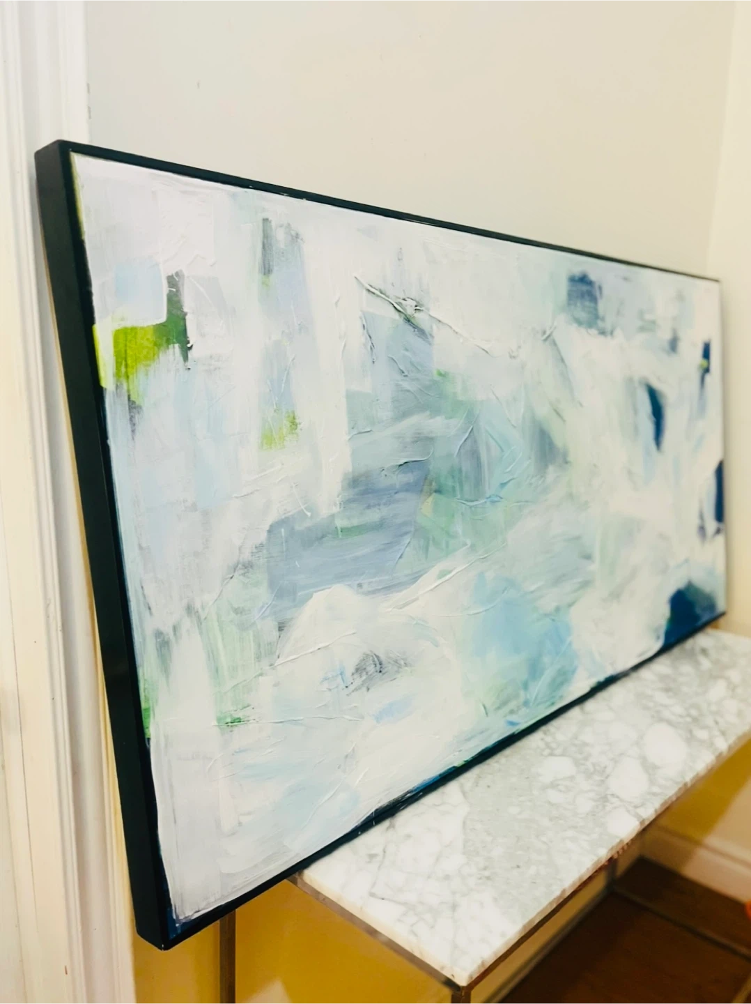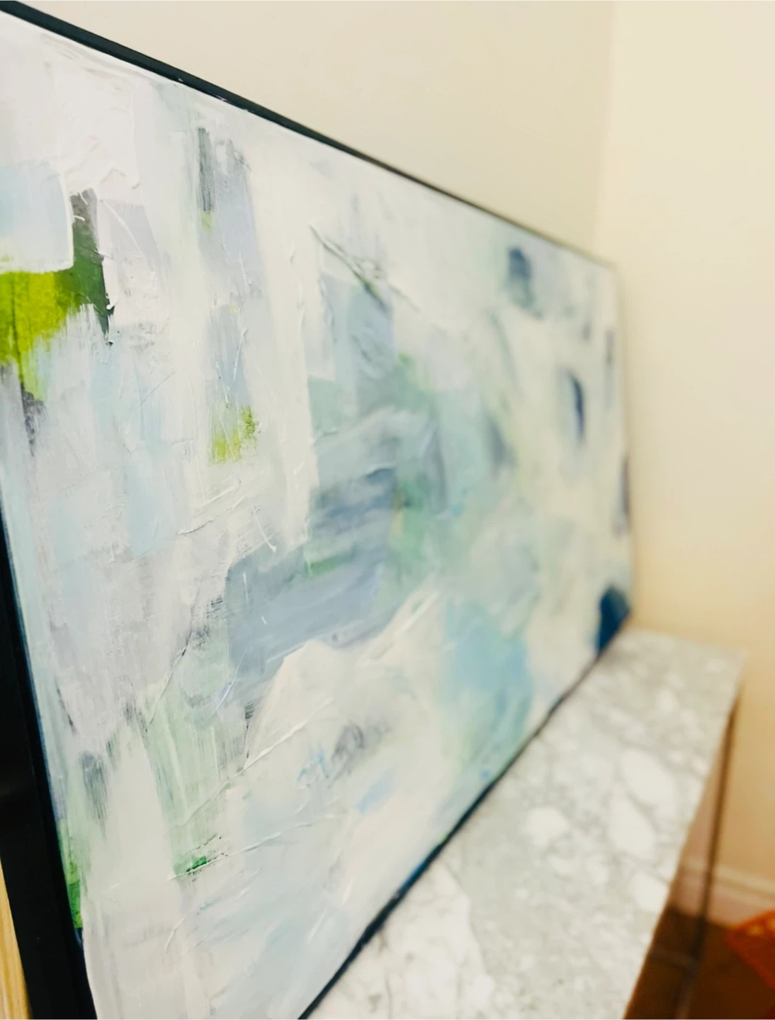 Beautiful original abstract painting with a textured finish. Features a blend of white, blue, and green tones with touches of dark blue and lime green. It's framed in a modern black wood floater frame.