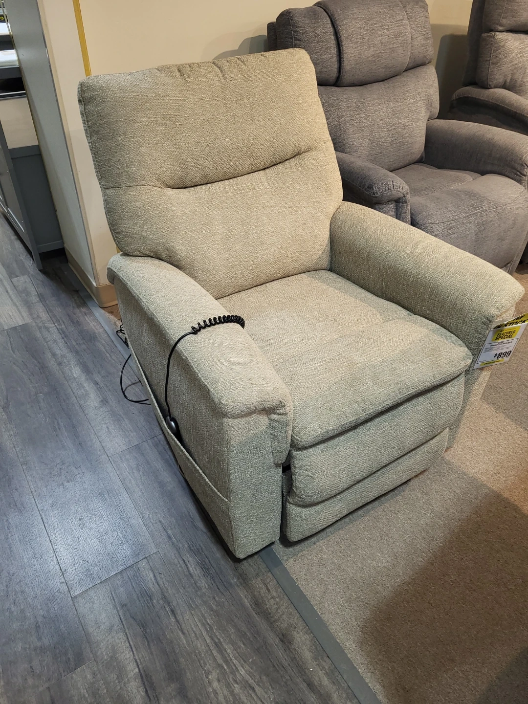 This power lift recliner chair is upholstered in a durable, textured fabric. It features a comfortable padded back and arms, with a convenient side pocket for remotes. The chair's lift mechanism helps users to stand up with ease. It's great for providing assistance and comfort.