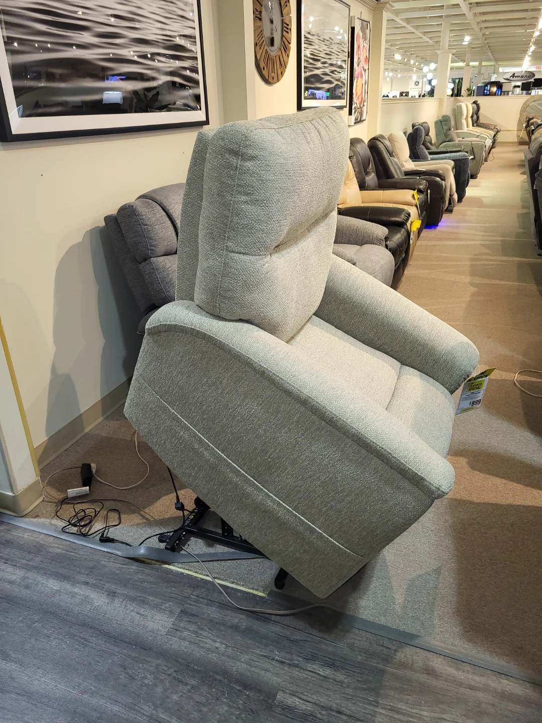 This power lift recliner chair is upholstered in a durable, textured fabric. It features a comfortable padded back and arms, with a convenient side pocket for remotes. The chair's lift mechanism helps users to stand up with ease. It's great for providing assistance and comfort.