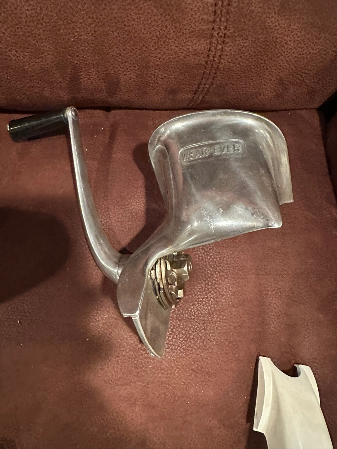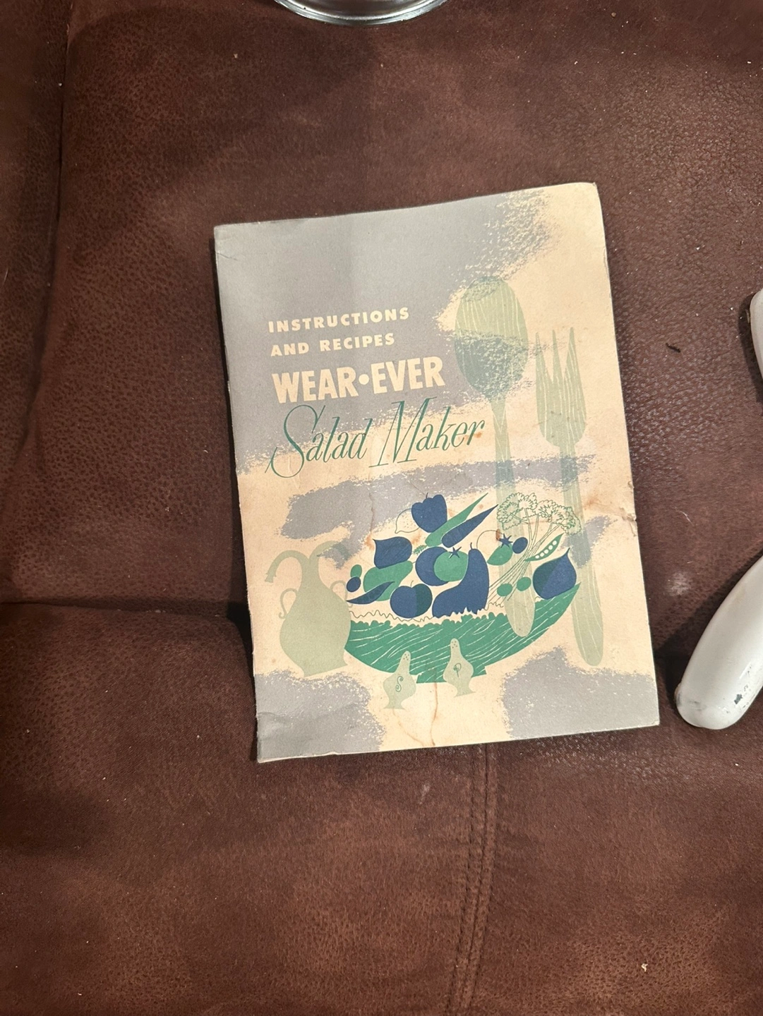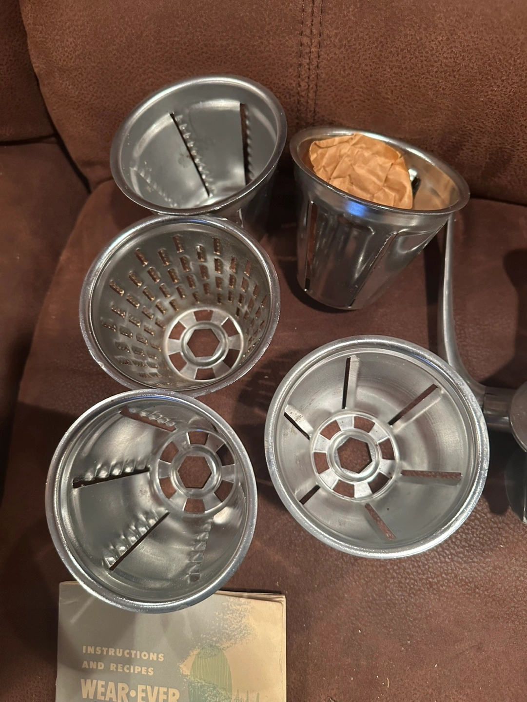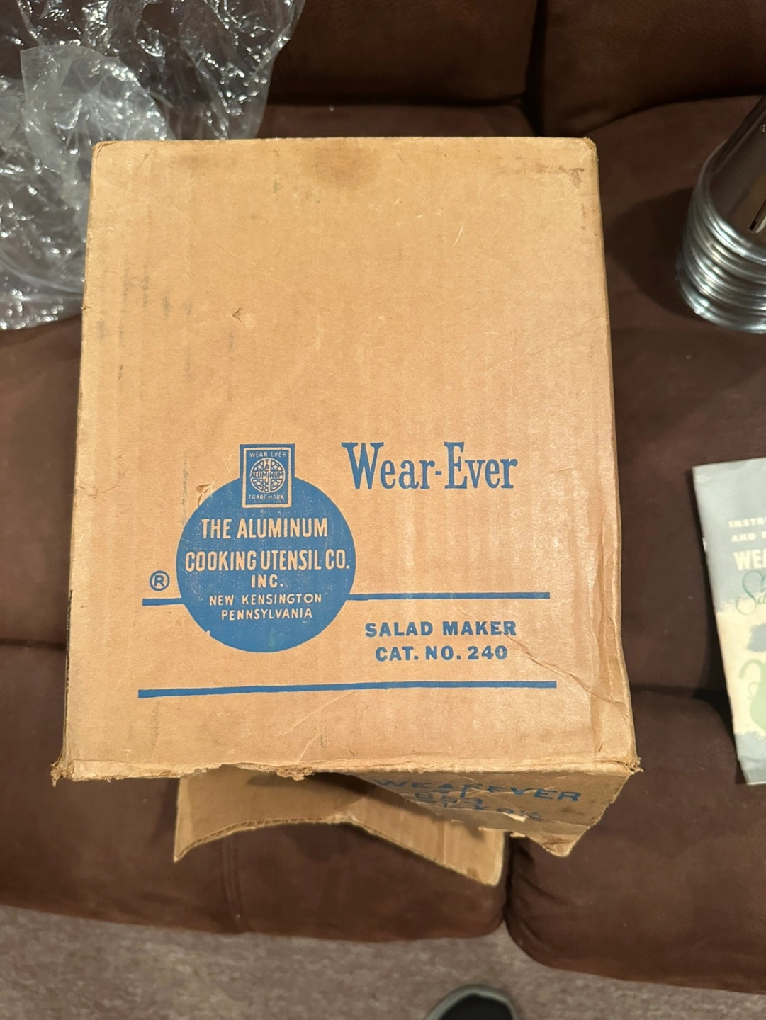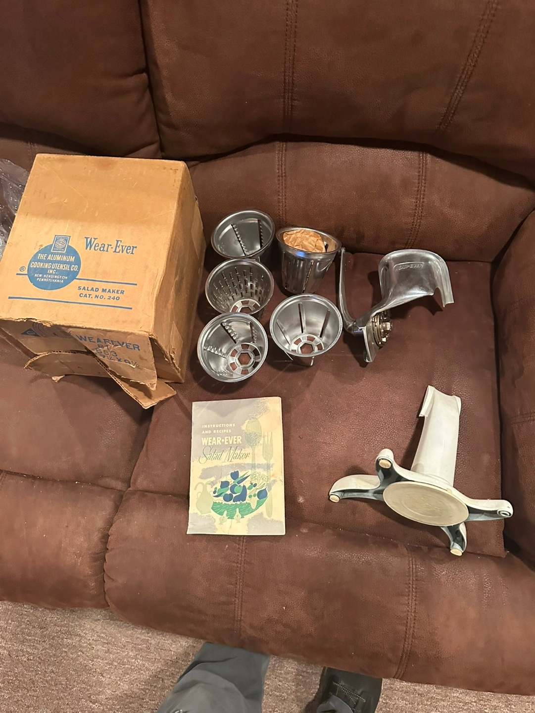 Vintage Wear-Ever Salad Maker. Model No. 240. Includes original box and instructions. Aluminum construction. Multiple slicing/shredding cones.