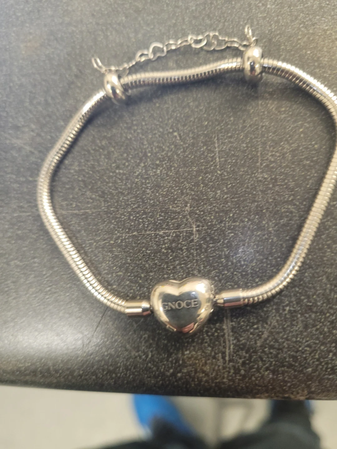 This Gnoce bracelet features a snake chain design with a central heart-shaped charm. It has an adjustable clasp for a comfortable fit. It's a lovely accessory for everyday wear or for adding to a charm collection.