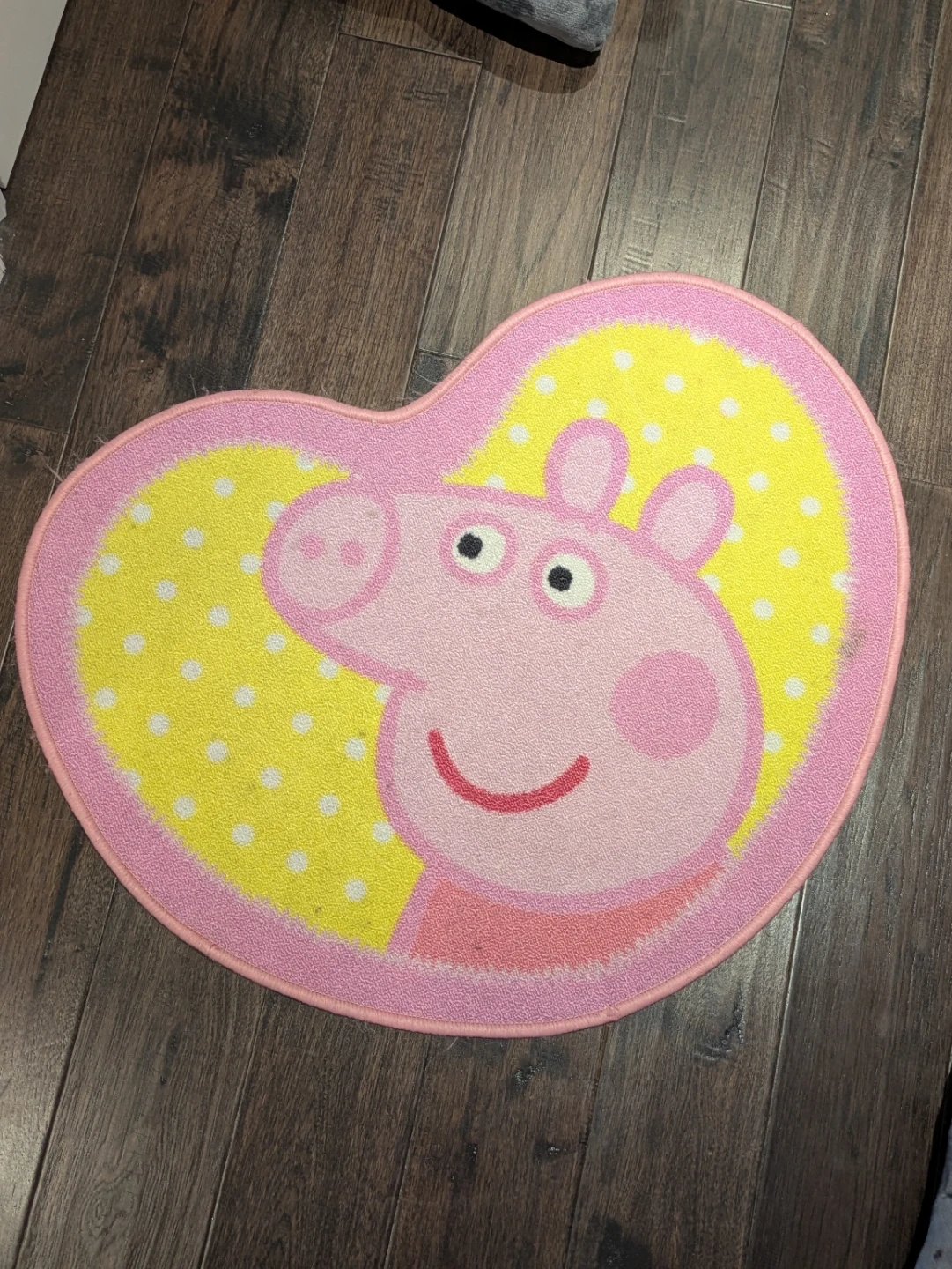 Add a touch of fun to your child's room with this adorable Peppa Pig heart-shaped rug! It's pink and yellow with a cute Peppa Pig design. The rug measures approximately 34 inches in length, perfect for a play area or bedroom