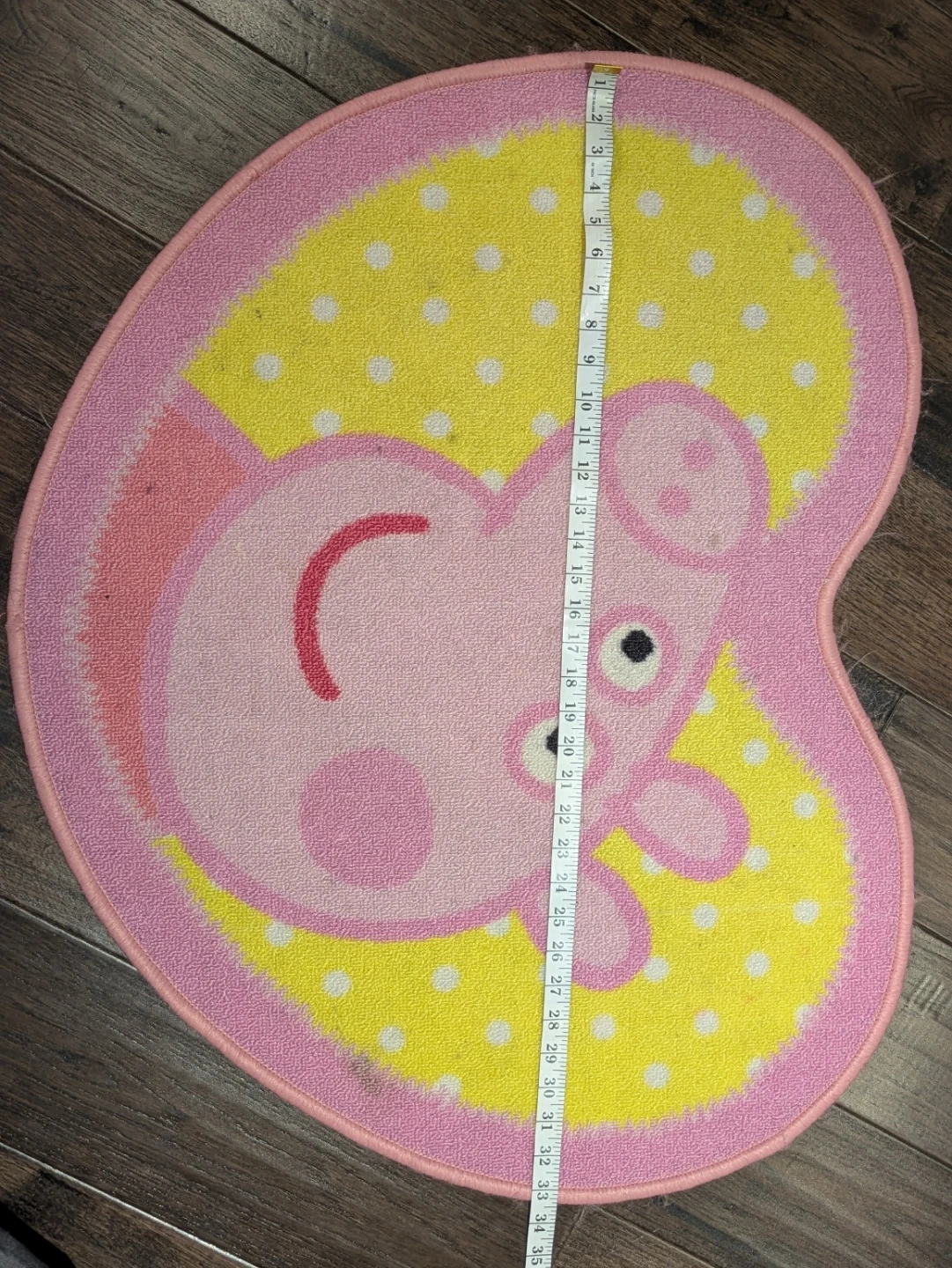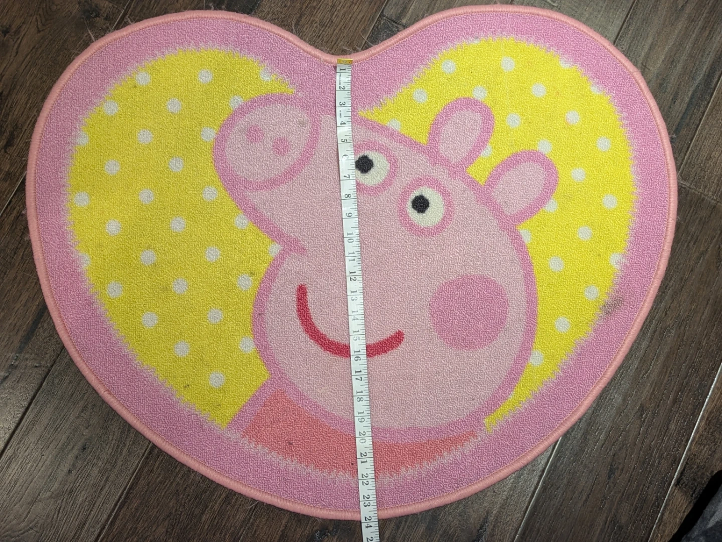 Add a touch of fun to your child's room with this adorable Peppa Pig heart-shaped rug! It's pink and yellow with a cute Peppa Pig design. The rug measures approximately 34 inches in length, perfect for a play area or bedroom