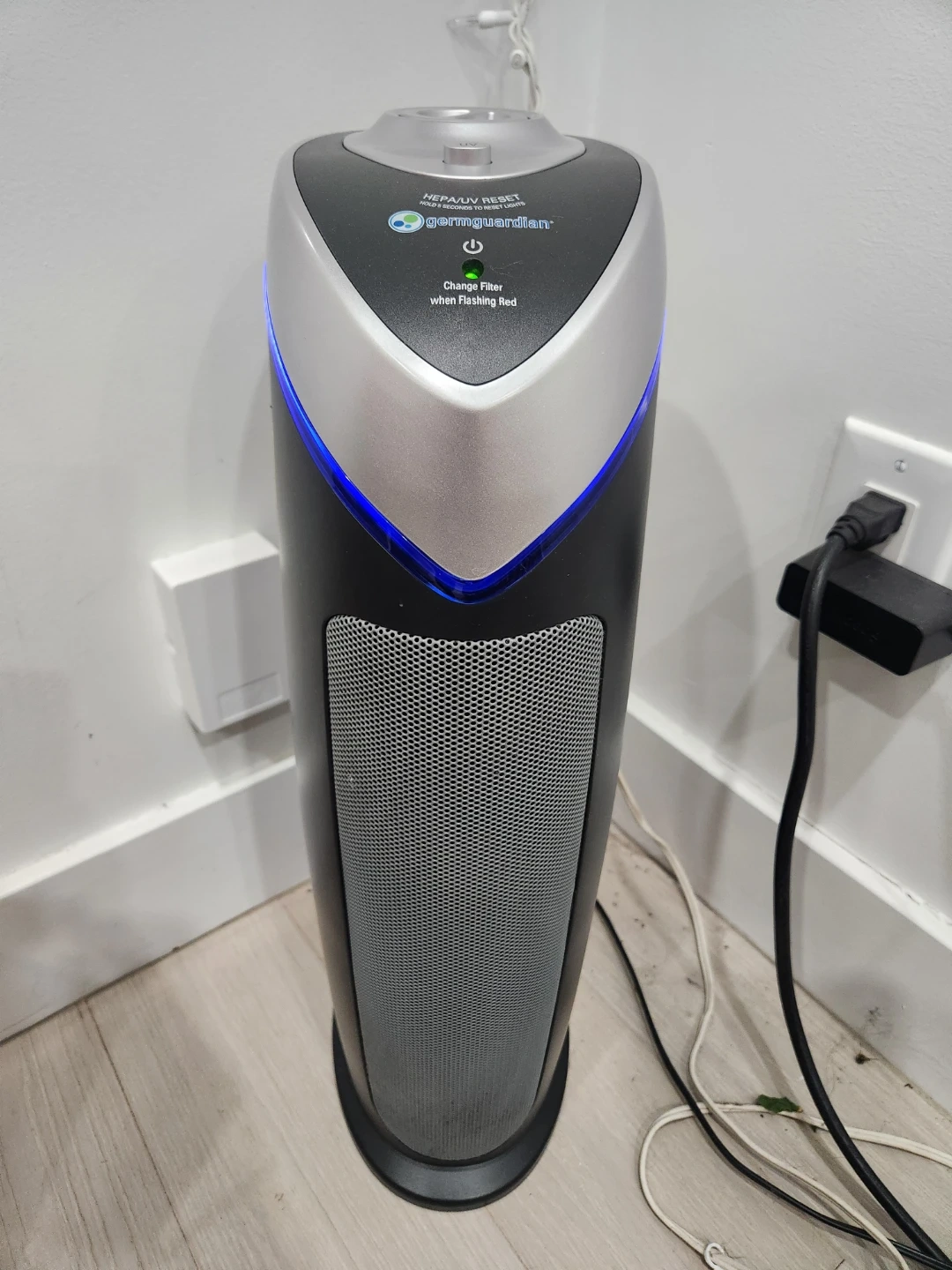 This GermGuardian air purifier features HEPA and UV technology. It's designed to clean the air in your home. The unit has a "Change Filter" indicator light.