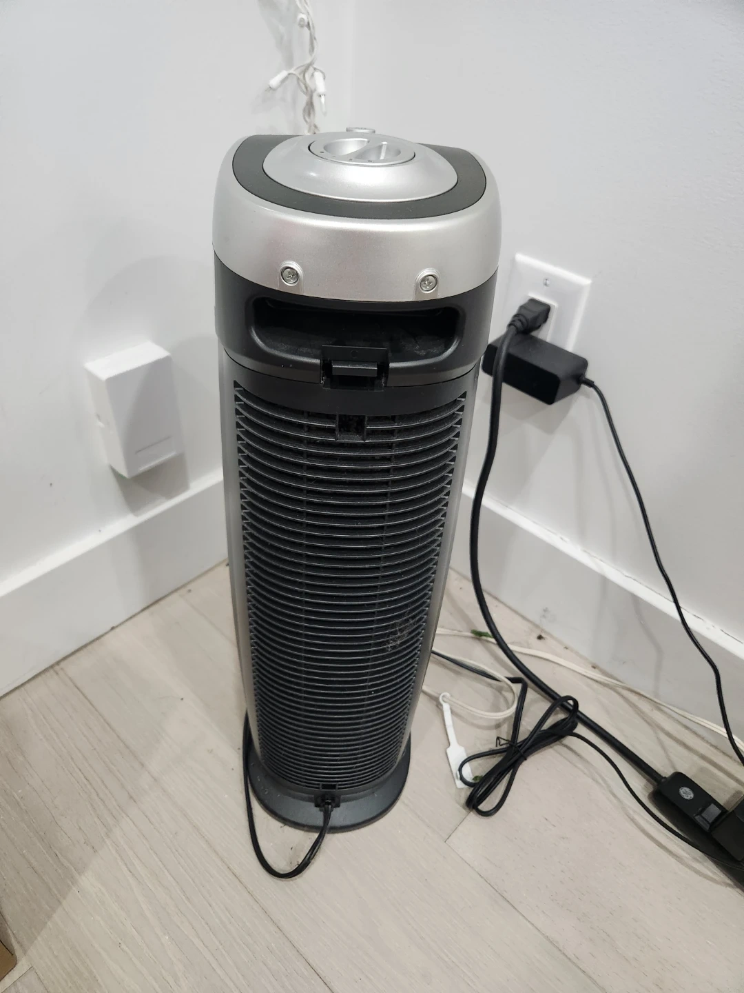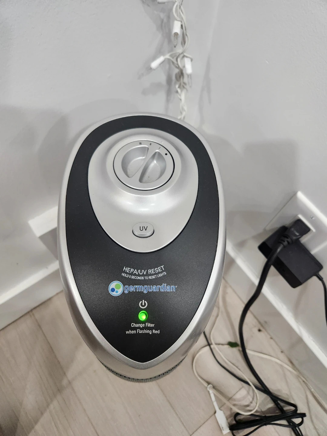 This GermGuardian air purifier features HEPA and UV technology. It's designed to clean the air in your home. The unit has a "Change Filter" indicator light.