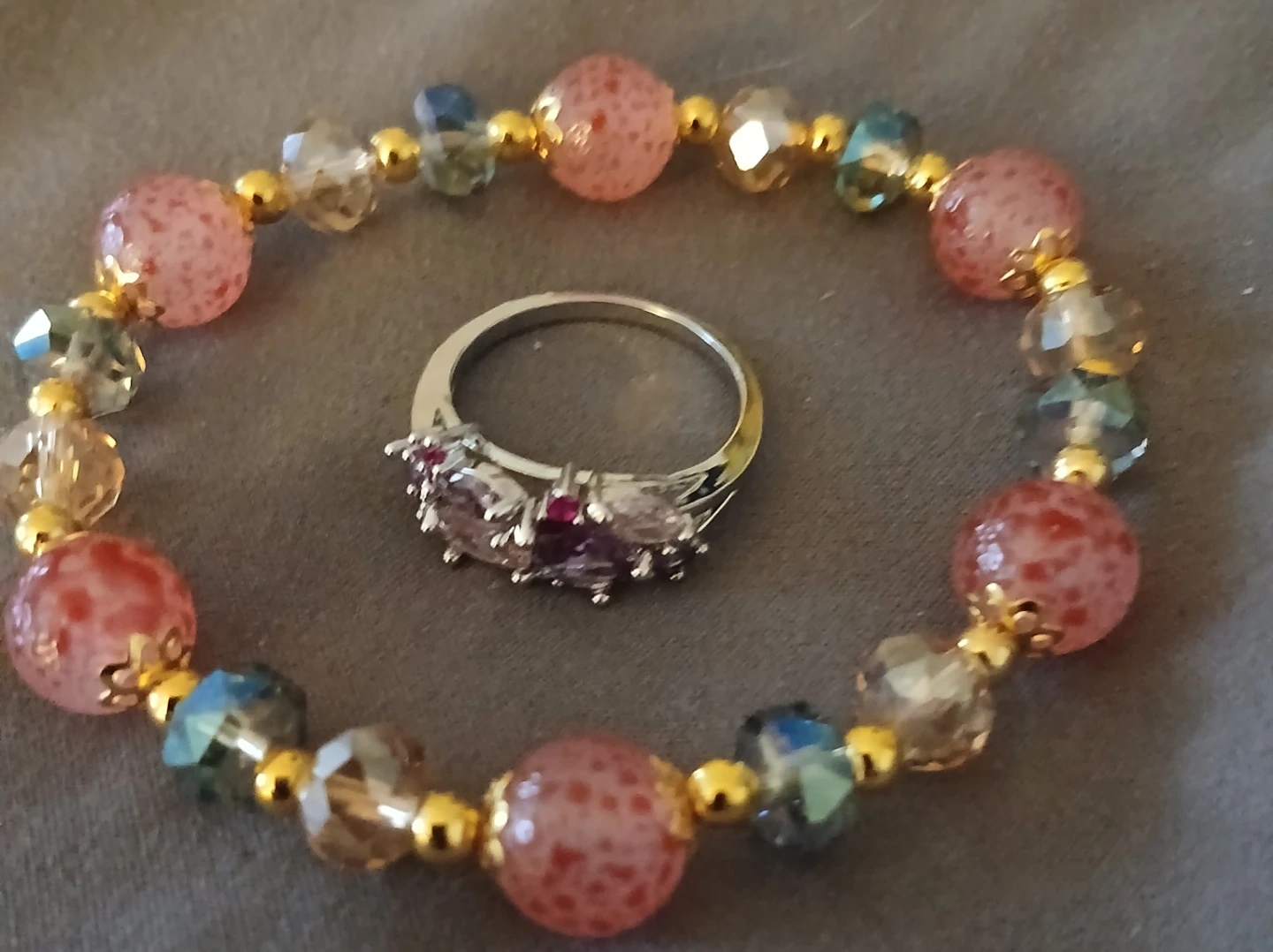 Pink beaded bracelet with gold accents and a silver-tone ring featuring purple and pink stones. This set adds a touch of sparkle to any outfit! A lovely accessory for yourself or as a gift.