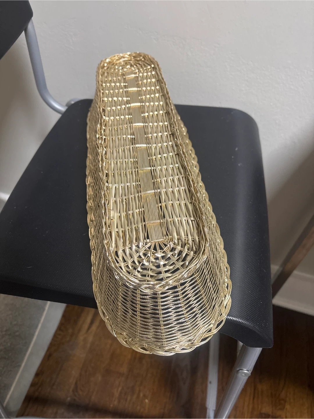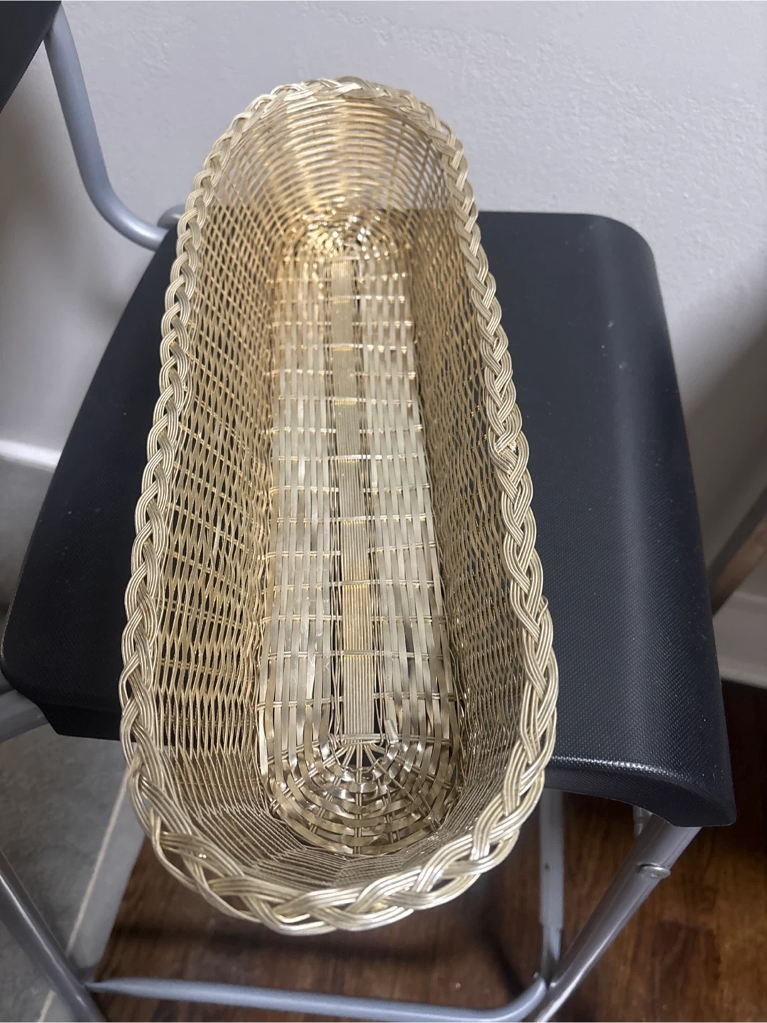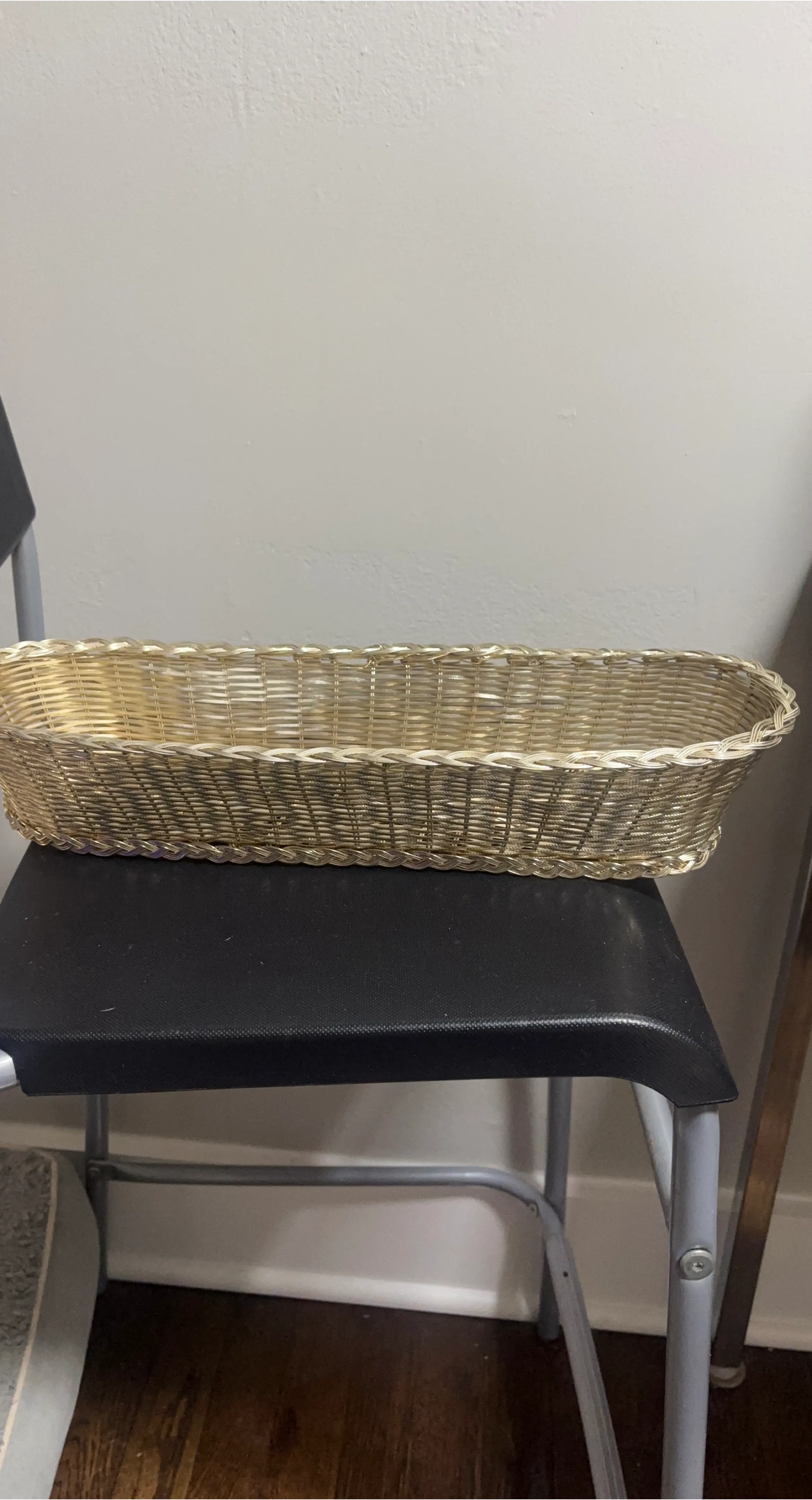 This is a long, oval-shaped basket with a woven wire design. It would work well for serving bread or as a decorative piece. The basket is made of metal wire.
